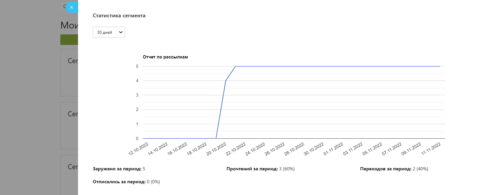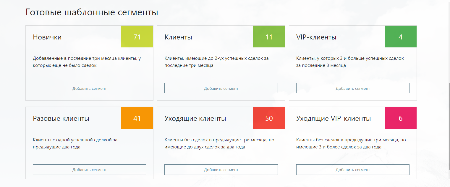 \- Анализ статистики сегмента – повысить средний чек и увеличить продажи. Для каждого сегмента можно посмотреть статистику количества успешных Сделок. Для оценки эффективности email-маркетинга поставьте KPI: конверсия в целевое действие; число переходов по ссылке из письма; количество недоставленных писем; коэффициент открываемости и другие показатели. Пользуйтесь аналитикой, чтобы точнее определять влияние контента на продажи.