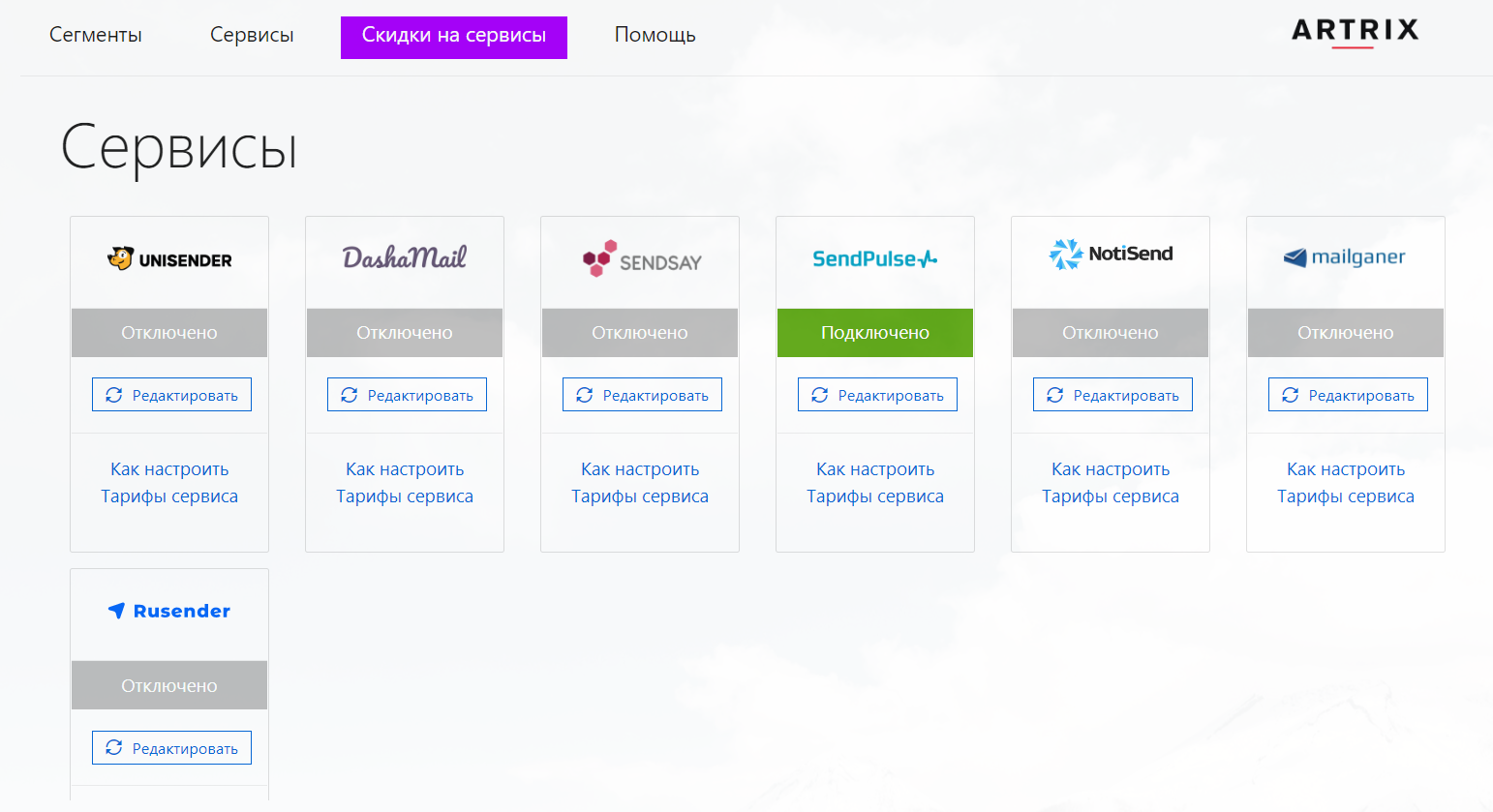 - Подключение к сервисам рассылок – задействовать разные каналы и возможности. Можно выбрать тот, который вы сейчас используете, подключить несколько сразу или переехать с одного на другой, не потеряв данные. Разные сервисы рассылок могут давать разные бенефиты, поэтому часть рассылок, скажем, может отправляться через sendpulse, а часть через unisender.
