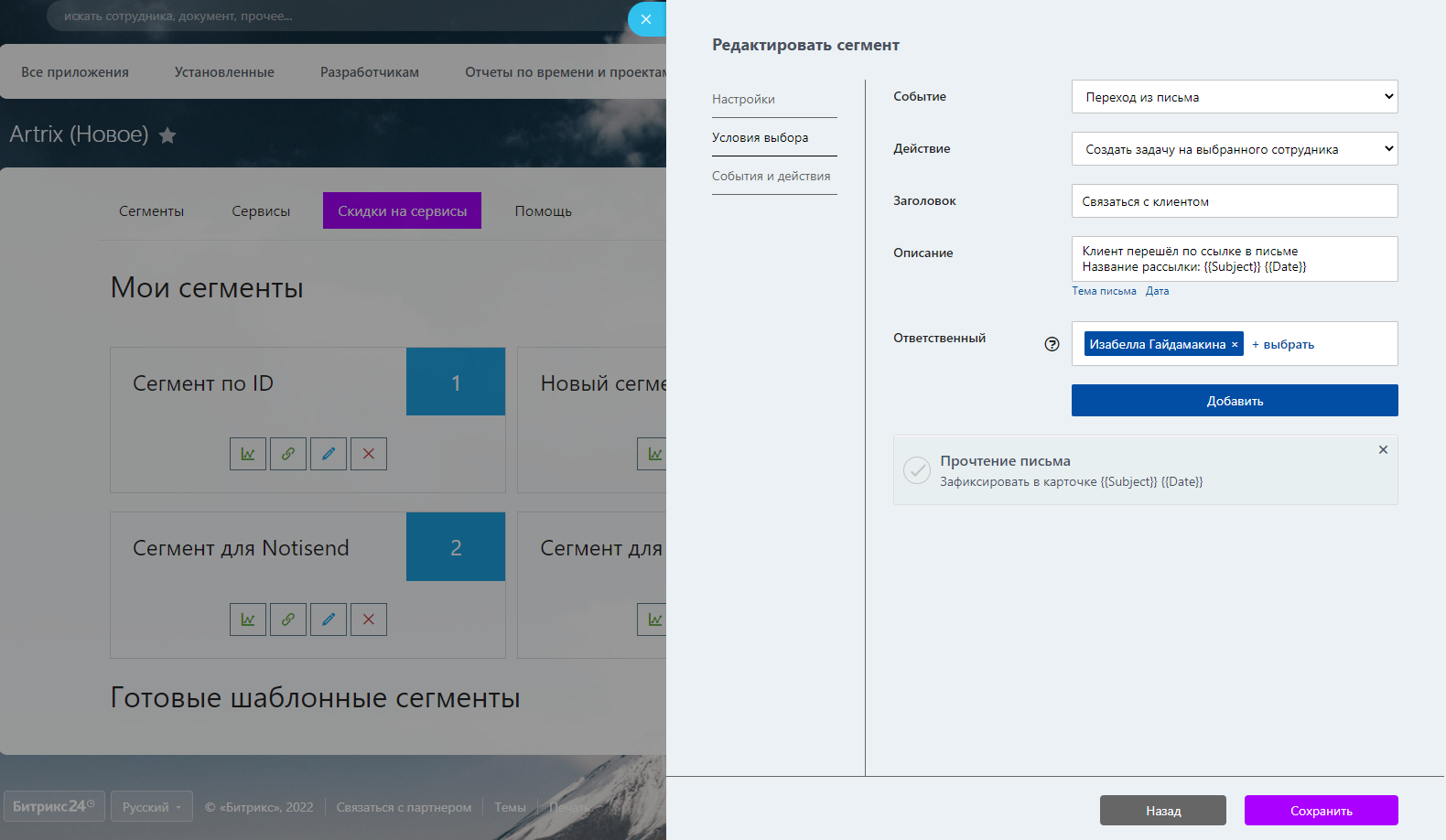 - Обработка действий в письмах и рассылках – дополнить клиентский сервис. Можно настроить, что делать, если клиент прочитал рассылку, перешёл по ссылке внутри или отписался – добавить запись в карточку, поставить задачу или запустить бизнес-процесс. Про клиента будет помнить не только система, но и менеджер, который свяжется для уточнения информации по заказу или доставке. Действия менеджера будут повышать лояльность и мотивировать клиентов покупать больше.