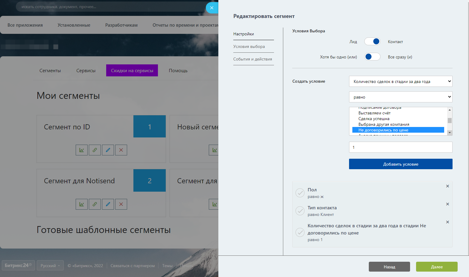 - Создание сегментов со сложными фильтрами позволит продавать конкретные товары. Опираться не только на поля ЛИДов и Контактов, но и таких данных, как дата добавления Лида или количество успешных Сделок за фиксированные периоды. Соединить данные из вашей CRM Битрикс24 и возможности любого из сервисов рассылок. Информация об интересах клиентов поможет грамотно сегментировать базу, а персонализированные рассылки увеличат продажи.