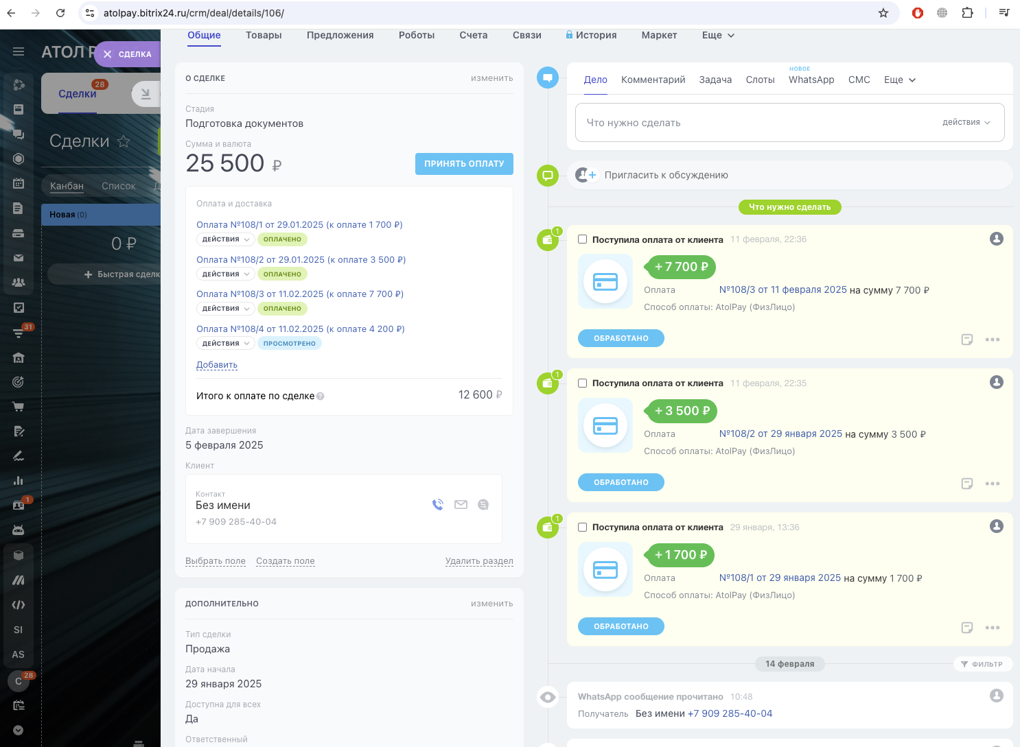 - Оплата через кнопку «Принять оплату» в сделке (чат-продажи).
