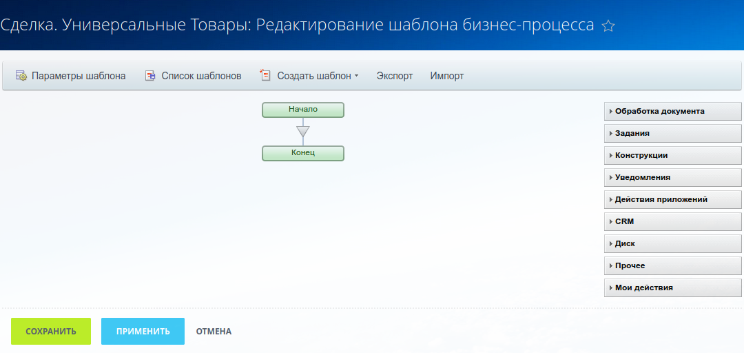 При установке Приложения, в бизнес-процессах сделок создается пустой одноименный шаблон бизнес-процесса "Универсальные Товары". Приложение выполняет свой шаблон бизнес-процесса каждый раз после нажатия кнопки "Сохранить" при редактировании Универсального Товара списка во вкладке в Сделке. Сначала пересчитается корзина Сделки, потом модифицируются элементы списка и выполняется шаблон. Такое решение позволяет реализовывать иные схемы, отличные от запуска шаблона на создании/изменении сделки. В шаблон "Универсальные Товары" вы можете размещать действия для реализации конструкции по описанным примерам выше. Выполнять этот шаблон из других шаблонов на сделках, списках и наоборот.