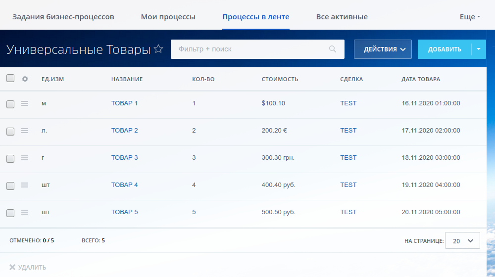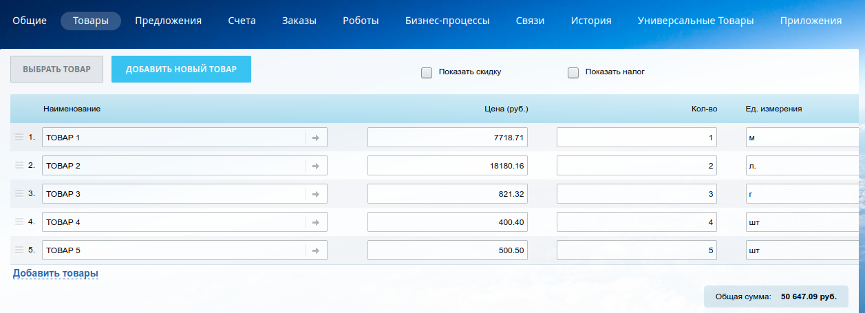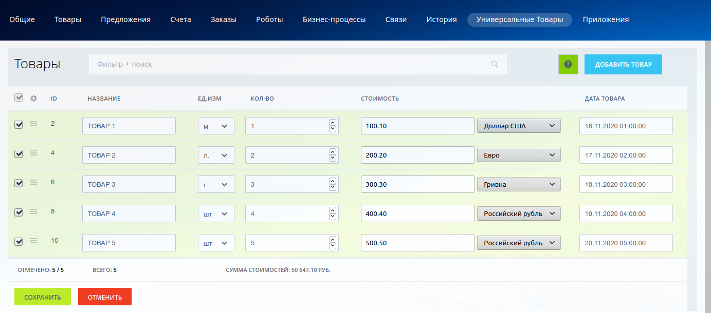 2. Разные валюты для Товаров одной Сделки. Хранятся в списке, а в Сделку пересчитываются к базовой валюте по курсам справочника CRM. Доступна любая валюта, настроенная в CRM.