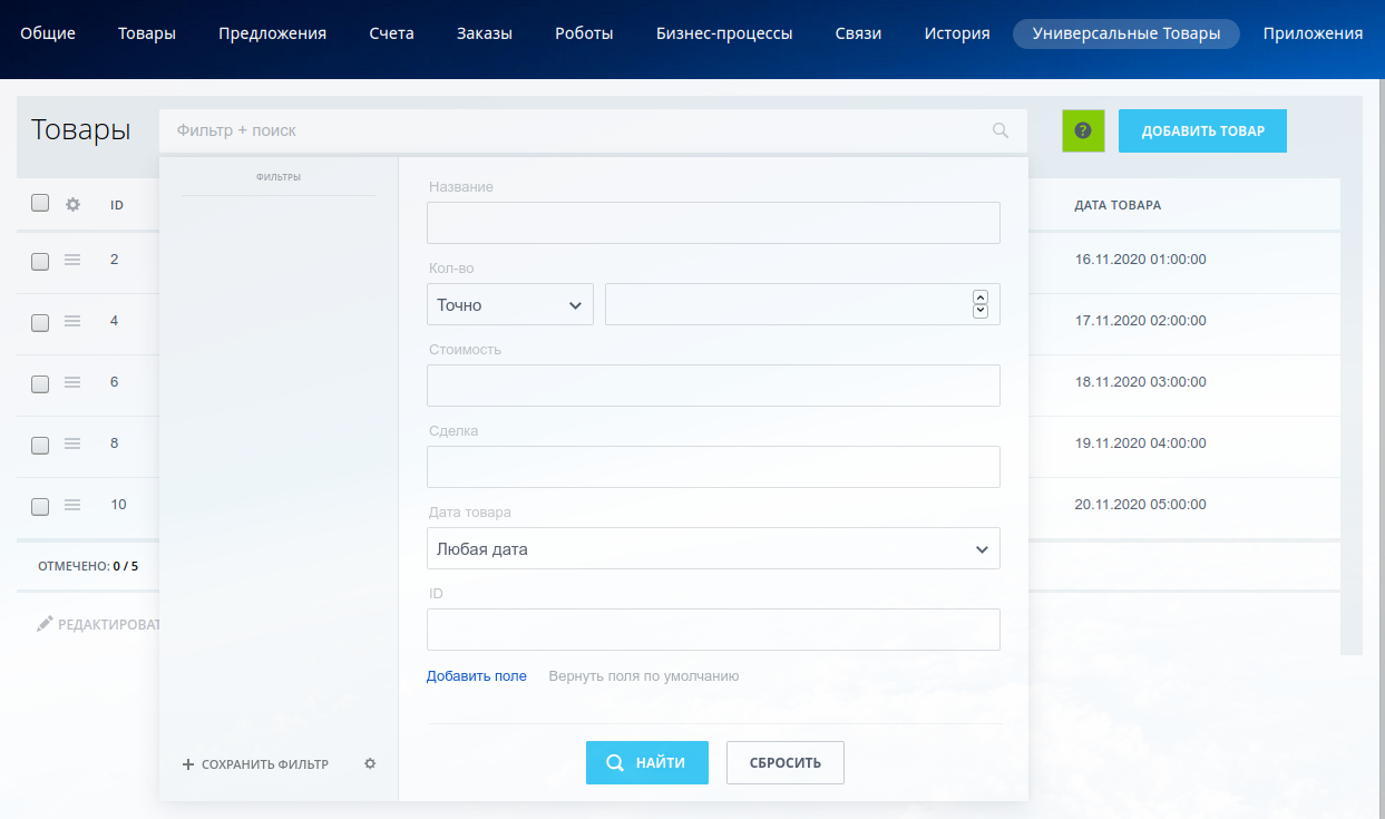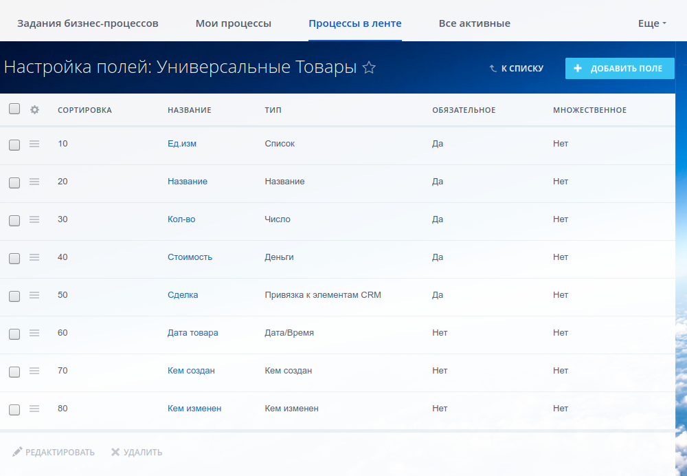 - Не удаляйте и не указывайте параметр "Обязательное" для ключевых полей списка "Универсальные товары": Ед.изм., Кол-во, Стоимость, Сделка.