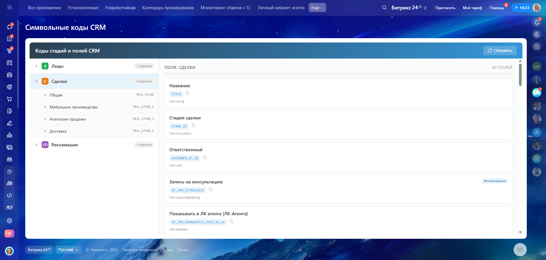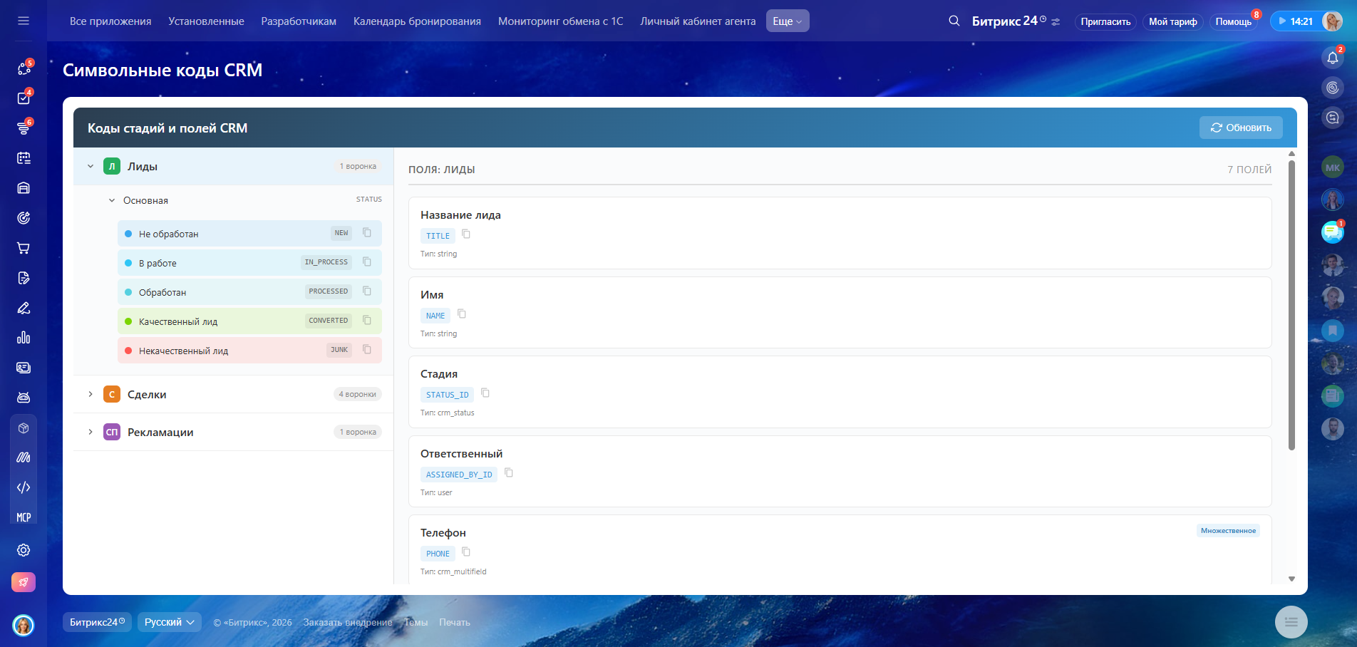 Приложение «Символьные коды CRM» предназначено для просмотра технической структуры CRM в удобном виде. Пользователи видят сущности CRM, воронки, поля и получают возможность копировать коды полей.