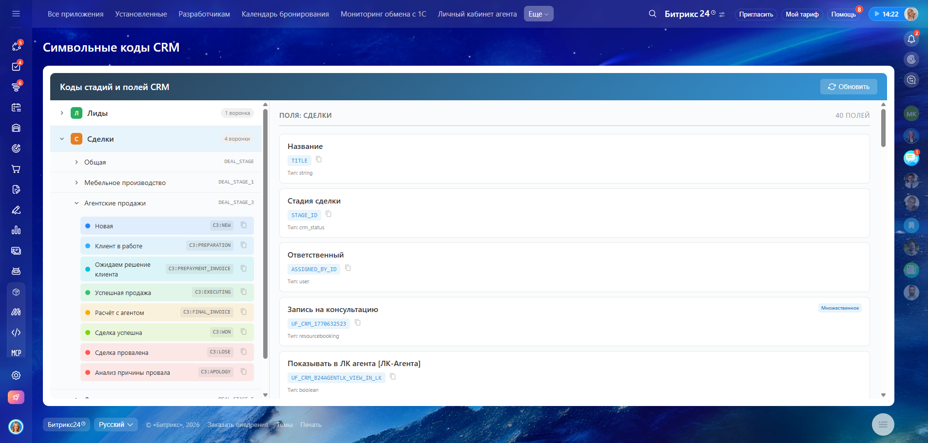 Используйте приложение, если нужно узнать код стадии для автоматизации, найти код пользовательского поля, проверить структуру CRM, разобраться в чужой настройке или подготовить интеграцию с внешней системой.