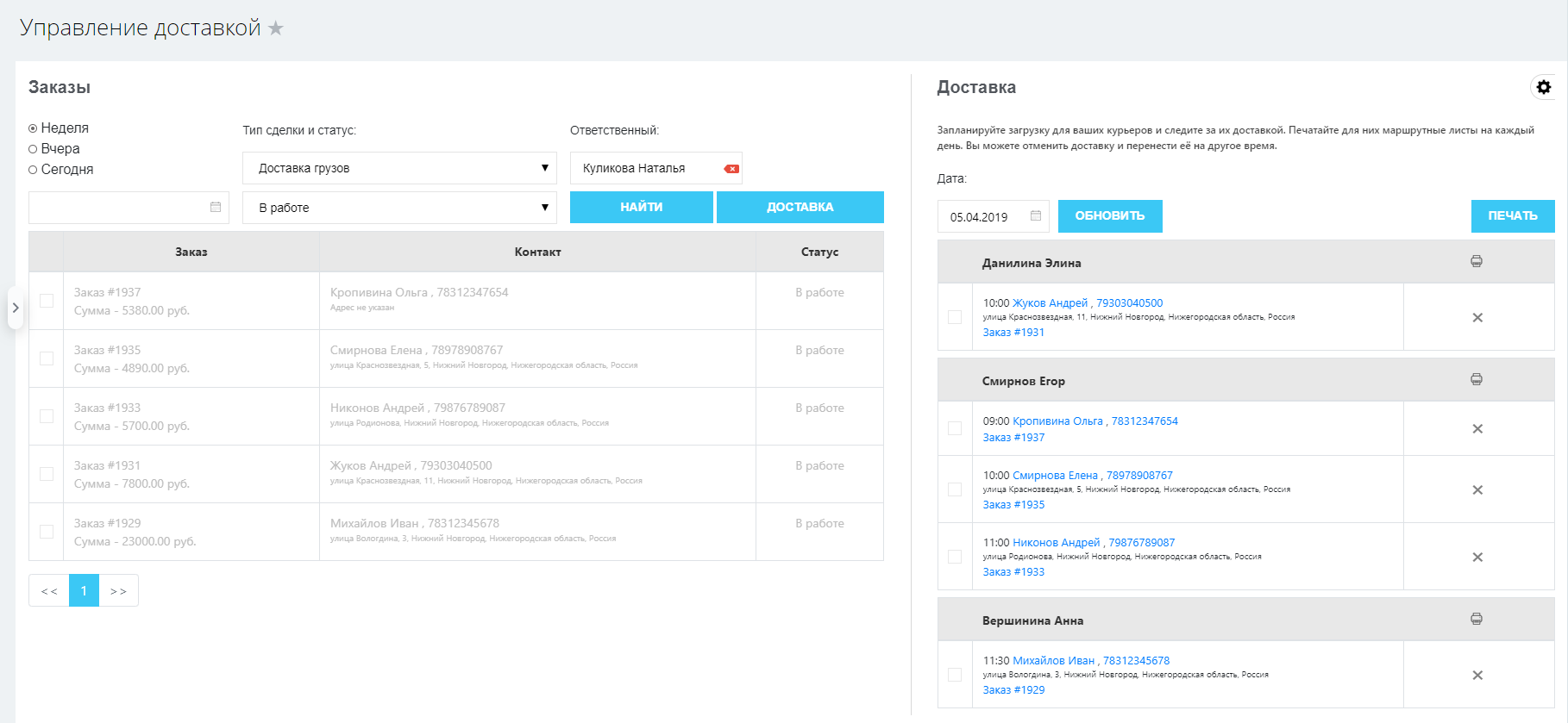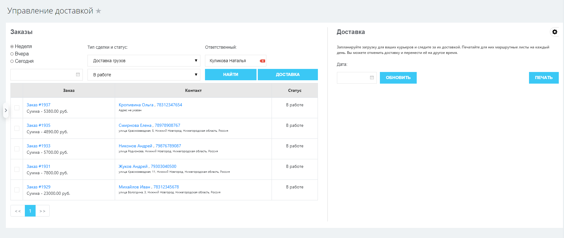 Рассматриваем случай, когда несколько сотрудников провели сделки до нужной стадии (готовность к отгрузке) и есть ответственный, который должен распределить доставки по одному или нескольким курьерам (водителям).