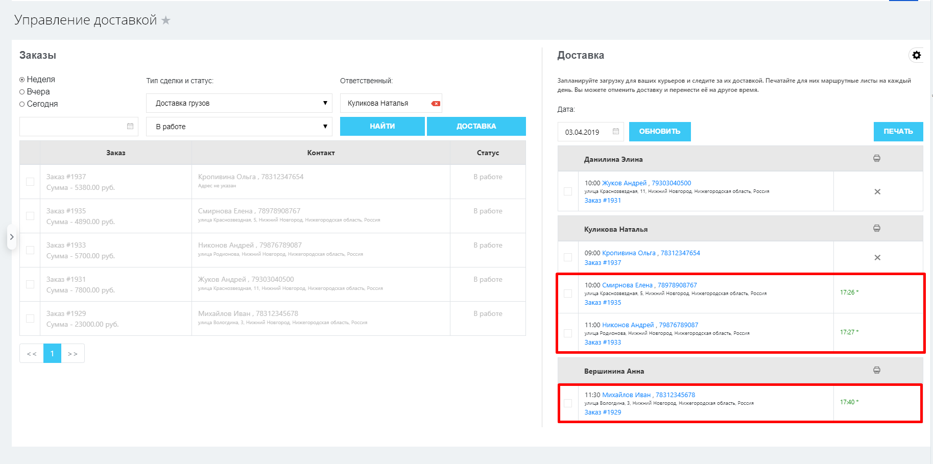 Повторяйте шаги выше для распределения доставок по разным курьерам (водителям).