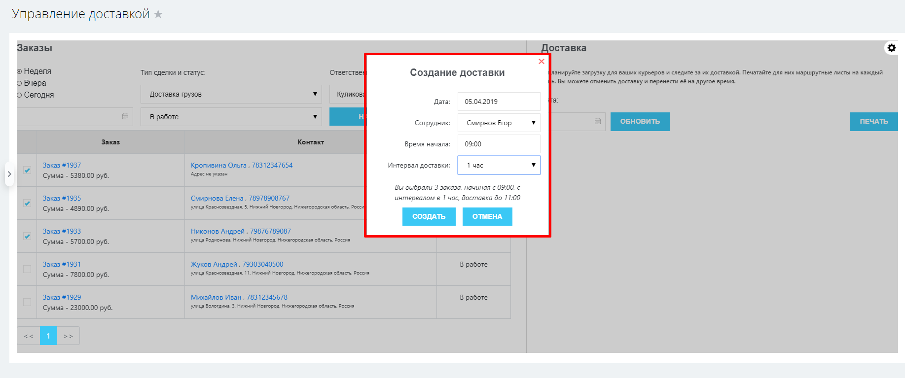На этом шаге вы отбираете сделки для одного экспедитора (курьера, водителя). Нажмите кнопку Доставка.