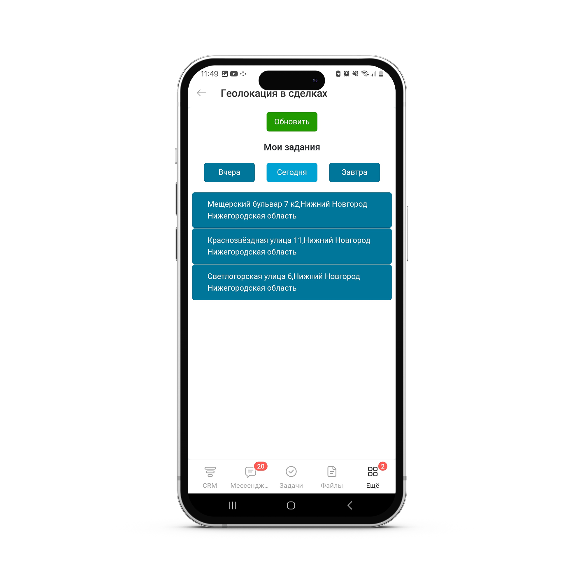 Мобильный сотрудник видит свои задания на сегодня, вчера или завтра.