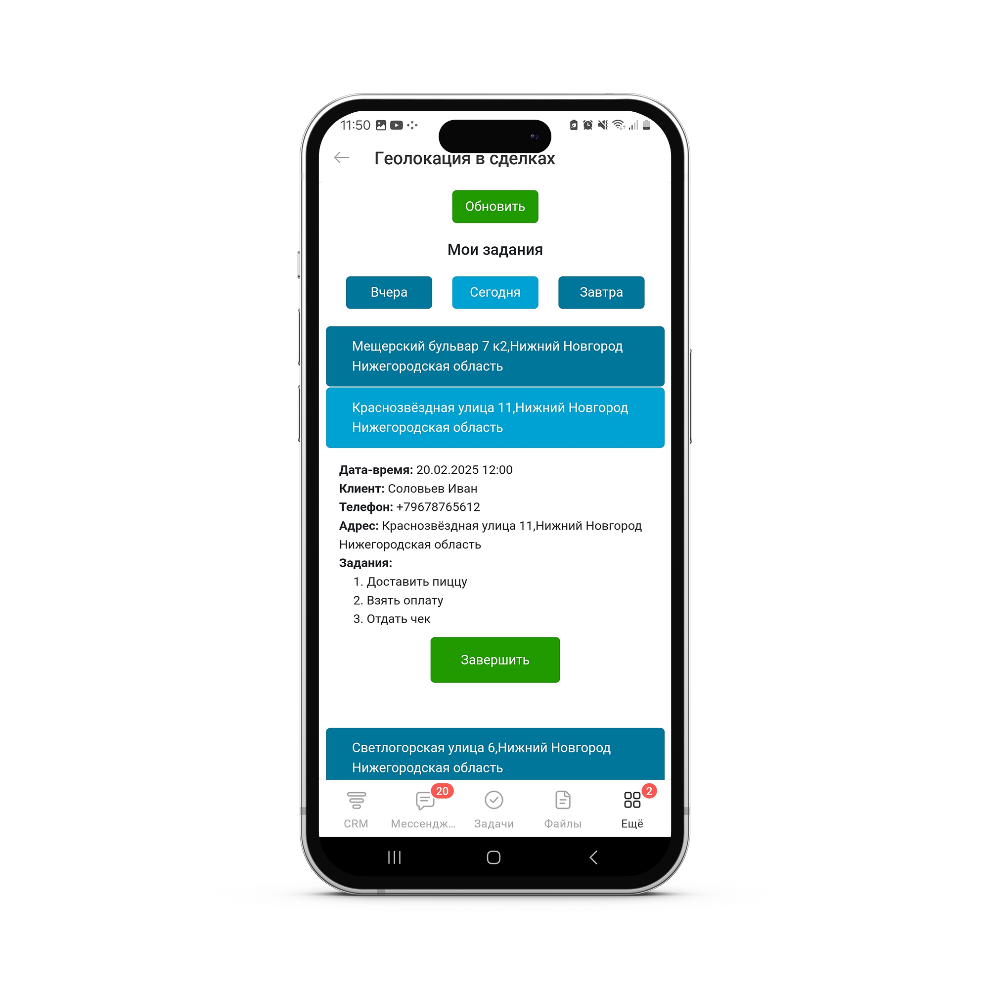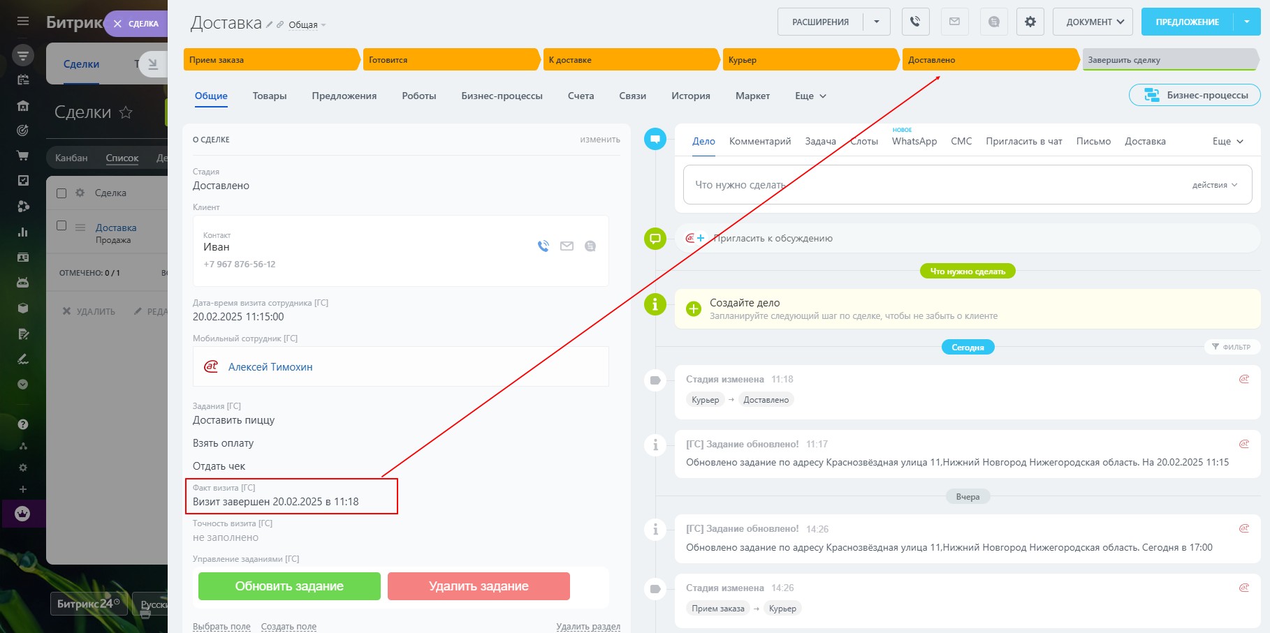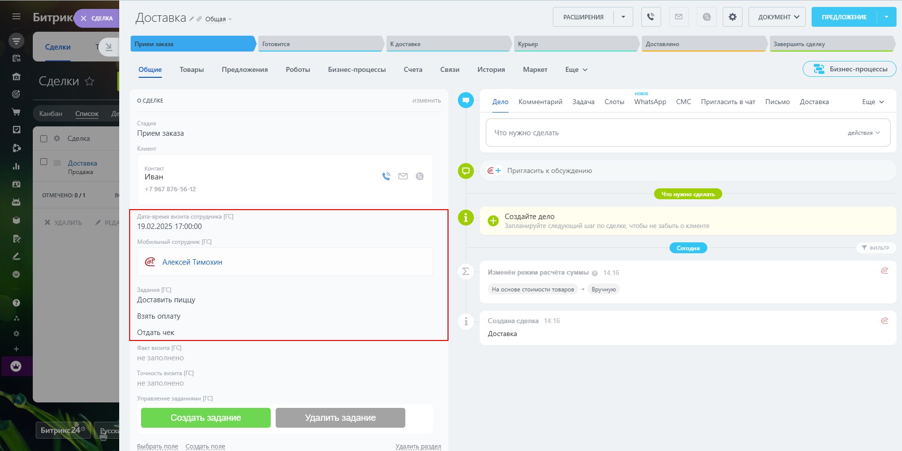 Таким образом, при смене этапа с «К доставке» на «Курьер» в мобильном приложении сотрудника, ответственного за доставку появится задание, связанное с этой сделкой.
