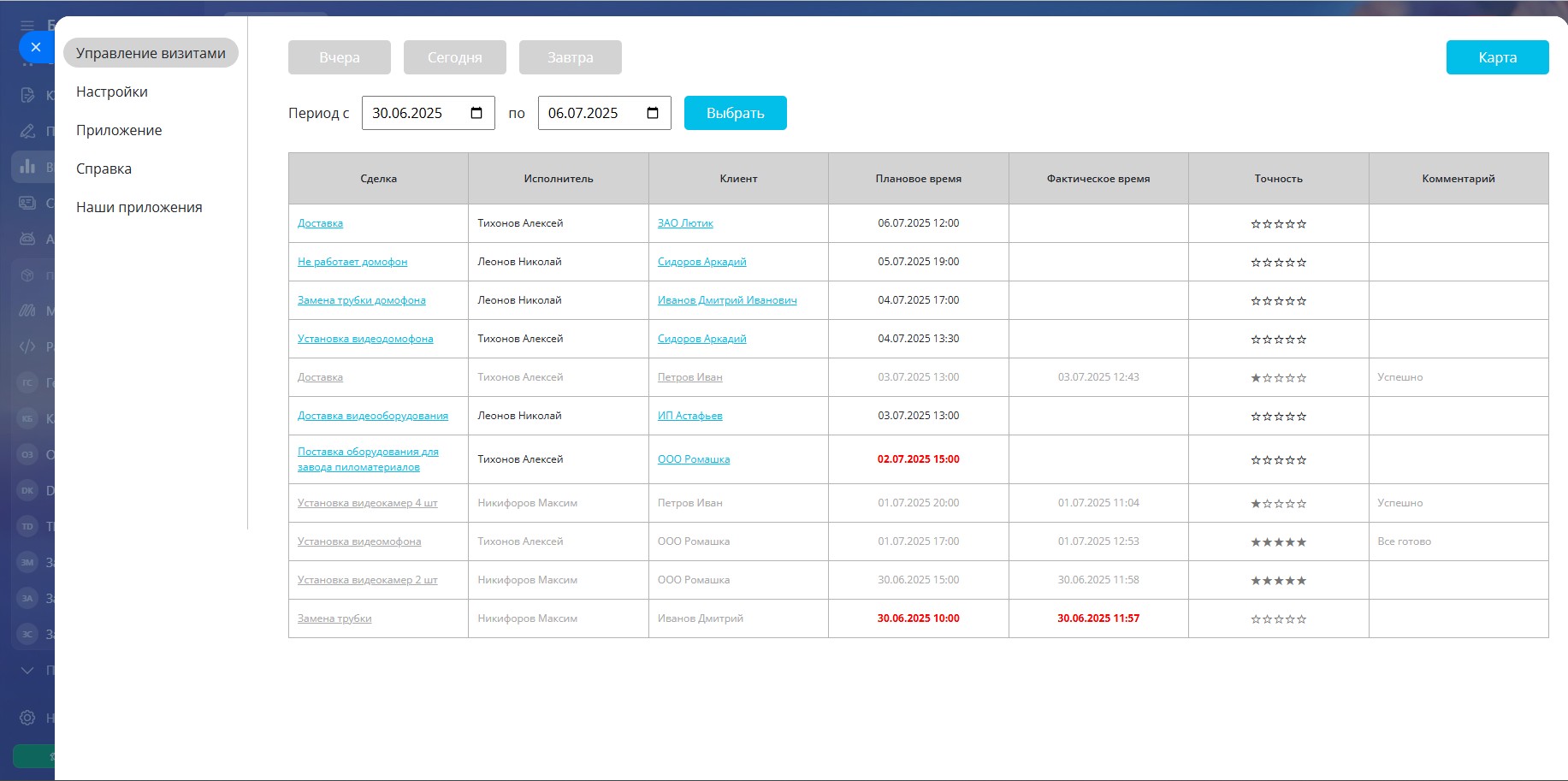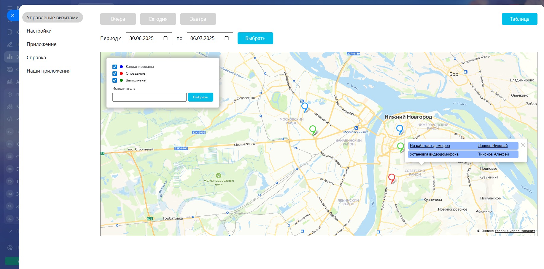Приложение позволяет вывести в табличный вид или на карту текущие визиты. Для этого перейдите в раздел "Управление визитами".