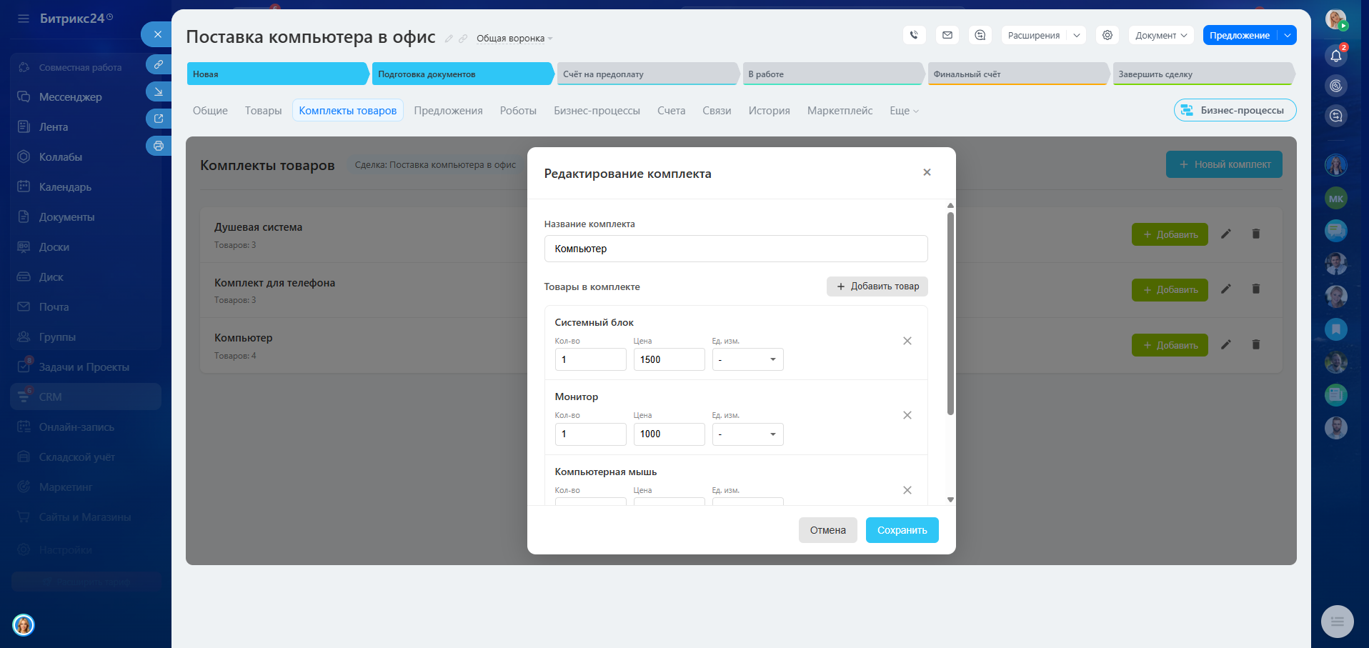Менеджер сможет быстро добавить весь комплект в сделку.
