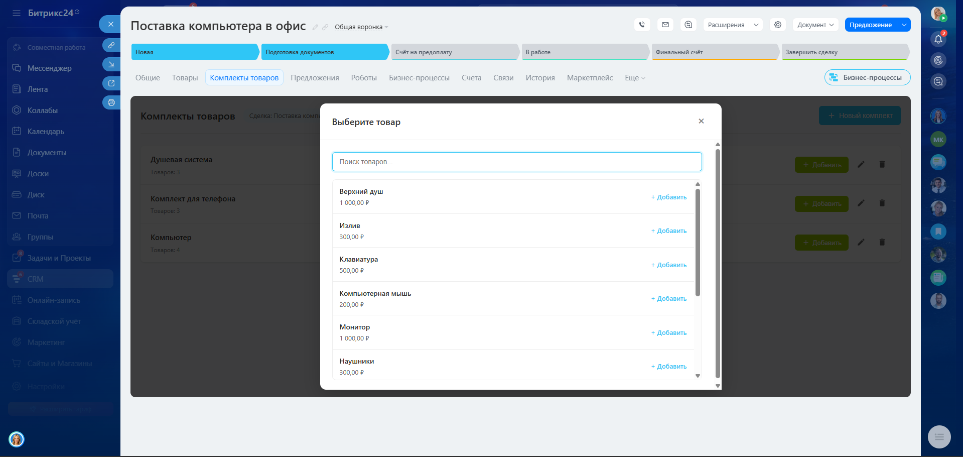 Теперь менеджер может выбрать нужный комплект товаров и сразу добавить его в сделку.