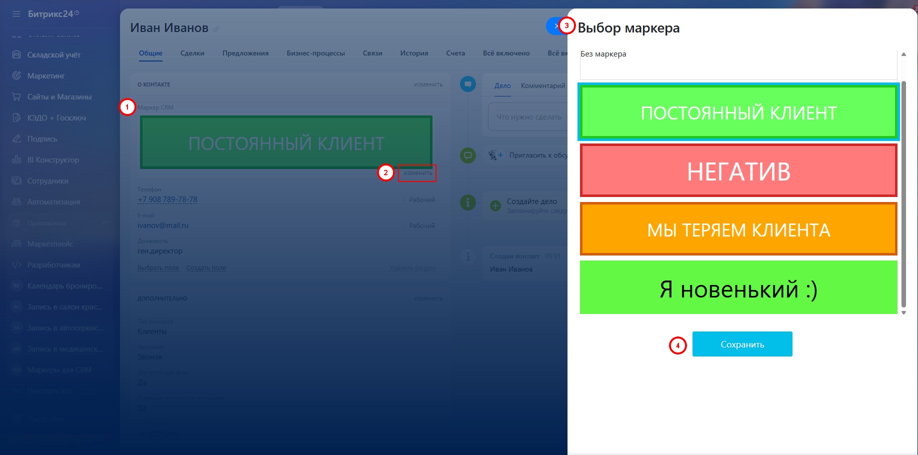 4. Все пользователи CRM смогут выбирать нужный маркер при работе с сущностями.