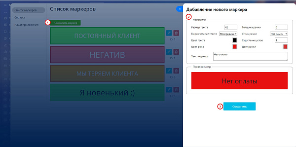 3. В настройках CRM вы можете составить свой список маркеров — выбрать любой цвет и короткий текст для каждого.