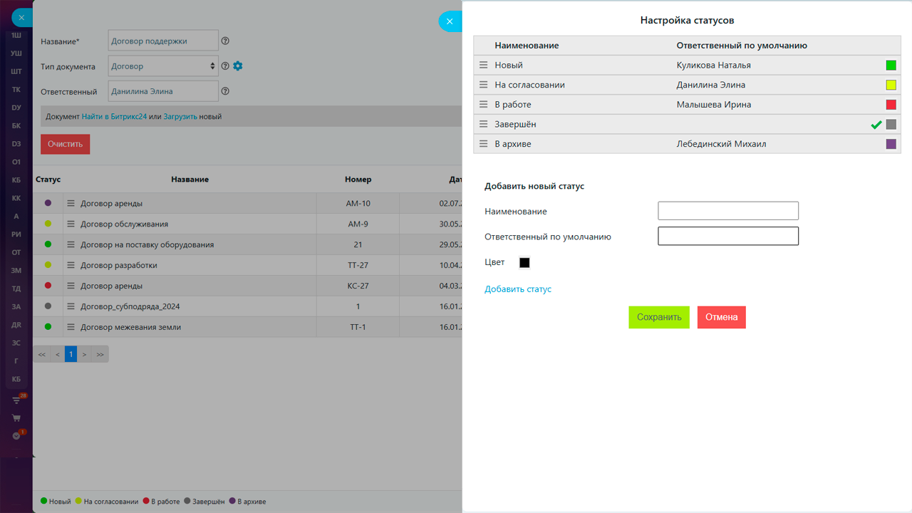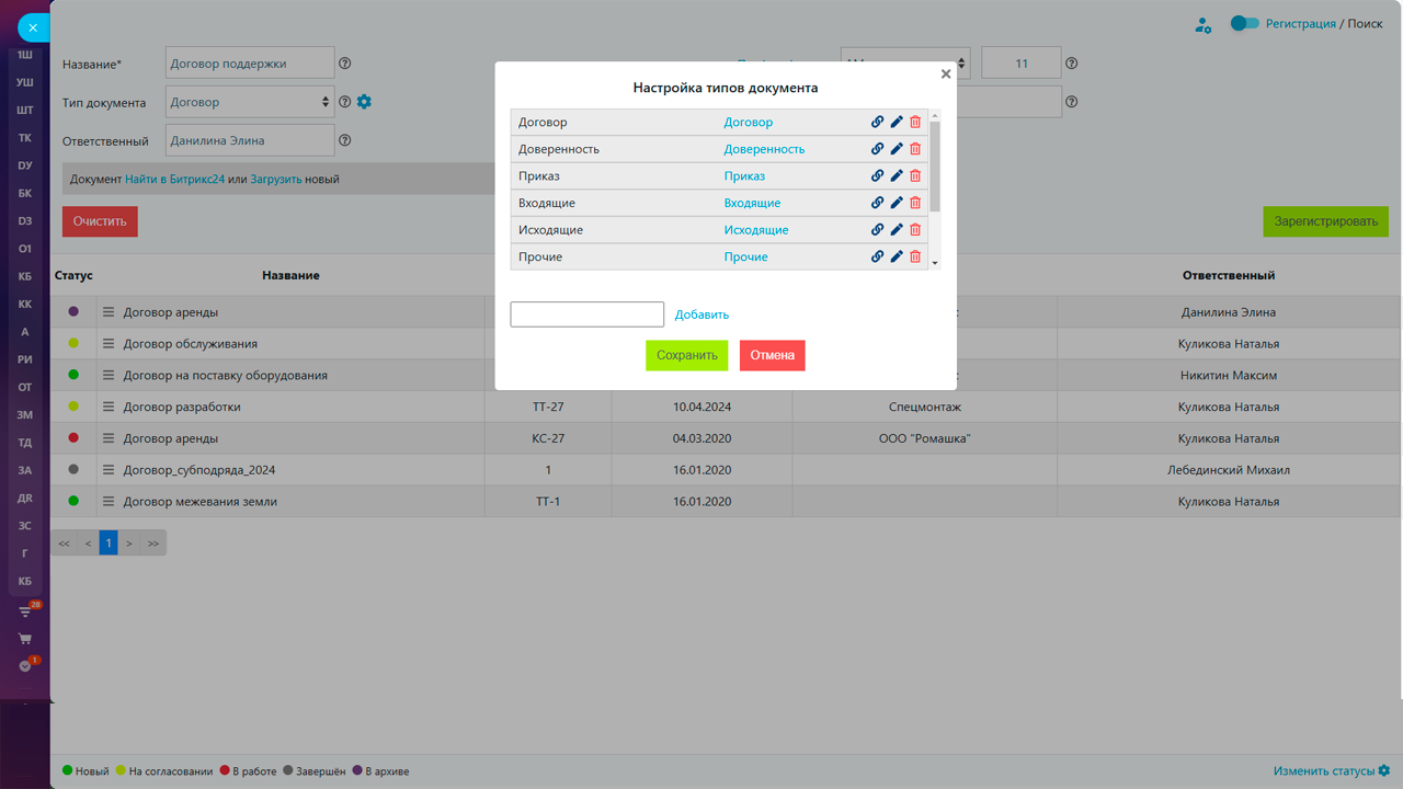 Многие пользователи хотят внедрить систему документооборота. Воспользуйтесь Моими документами, устанавливайте статусы на каждый документ, а также ответственного сотрудника за этот статус. Вы можете расширить предлагаемый по умолчанию набор статусов и настроить визуальное представление (цвета). Таким образом, использование статусов и ответственного за документ позволяет настроить несложную систему документооборота.