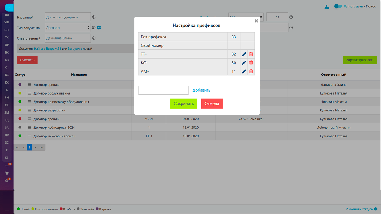 Мы продумали гибкую систему нумерации документов. Вы можете добавить свой тип документов и разные префиксы нумерации для каждого типа документов. Вы можете корректировать значения нумерации (например, на начало года).