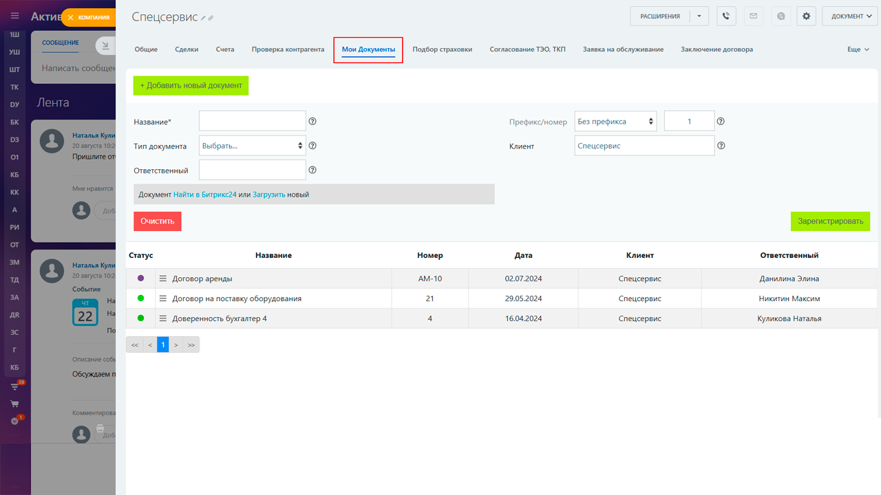 Находясь во вкладке Мои документы в карточке Компании вы можете создавать новые документы (но только под текущего Клиента) и использовать все функции выпадающего меню для каждого документа в списке.