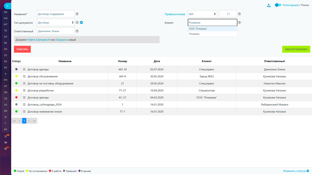 Каждый документ в приложении можно связать с Клиентом в CRM и далее осуществлять поиск по всем документам этого клиента. Вы можете изменить Клиента, для этого используйте выпадающее меню.