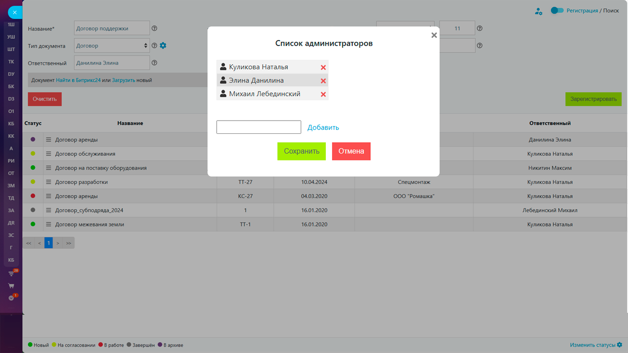 - Установка ответственных за документ