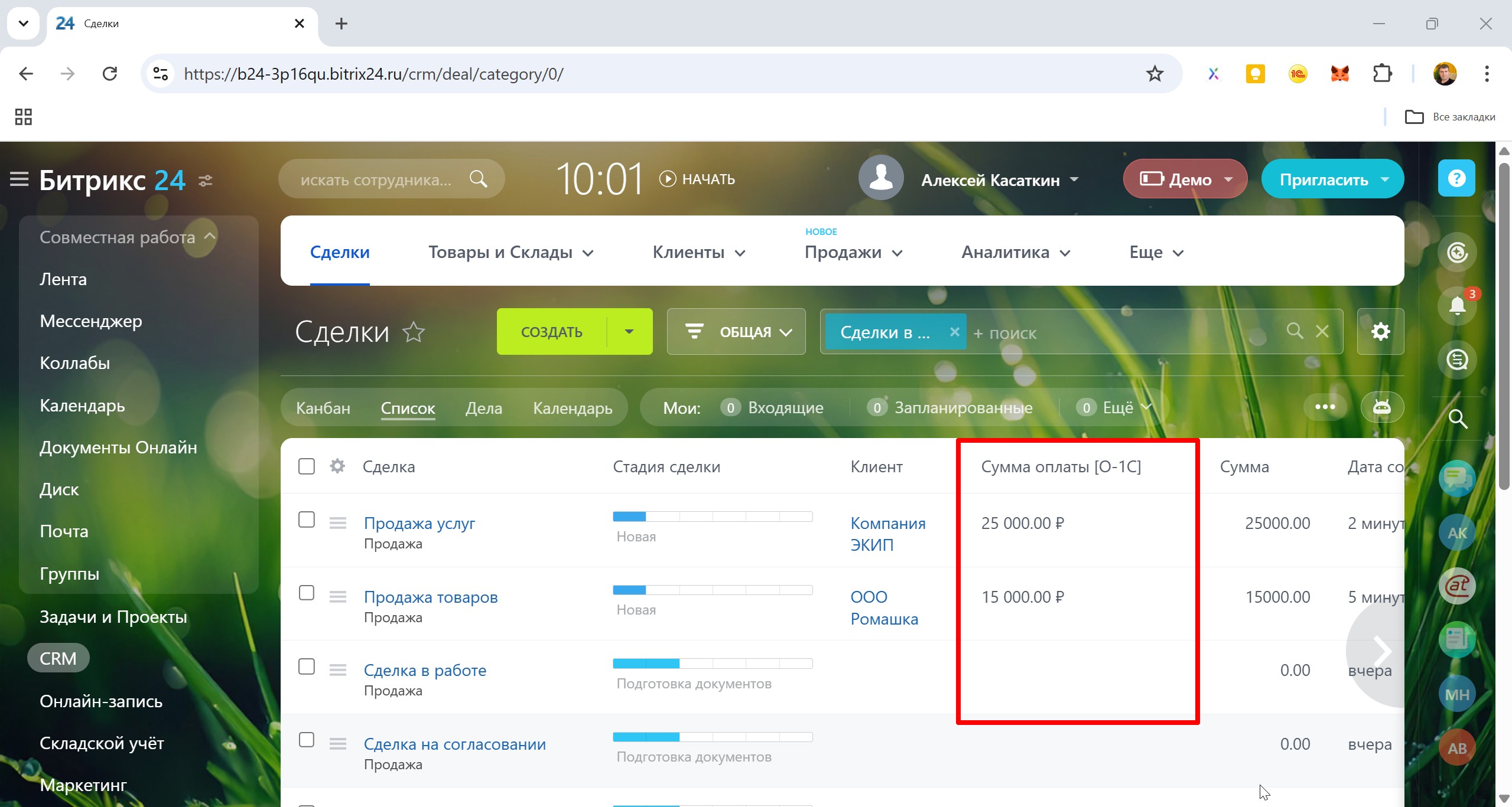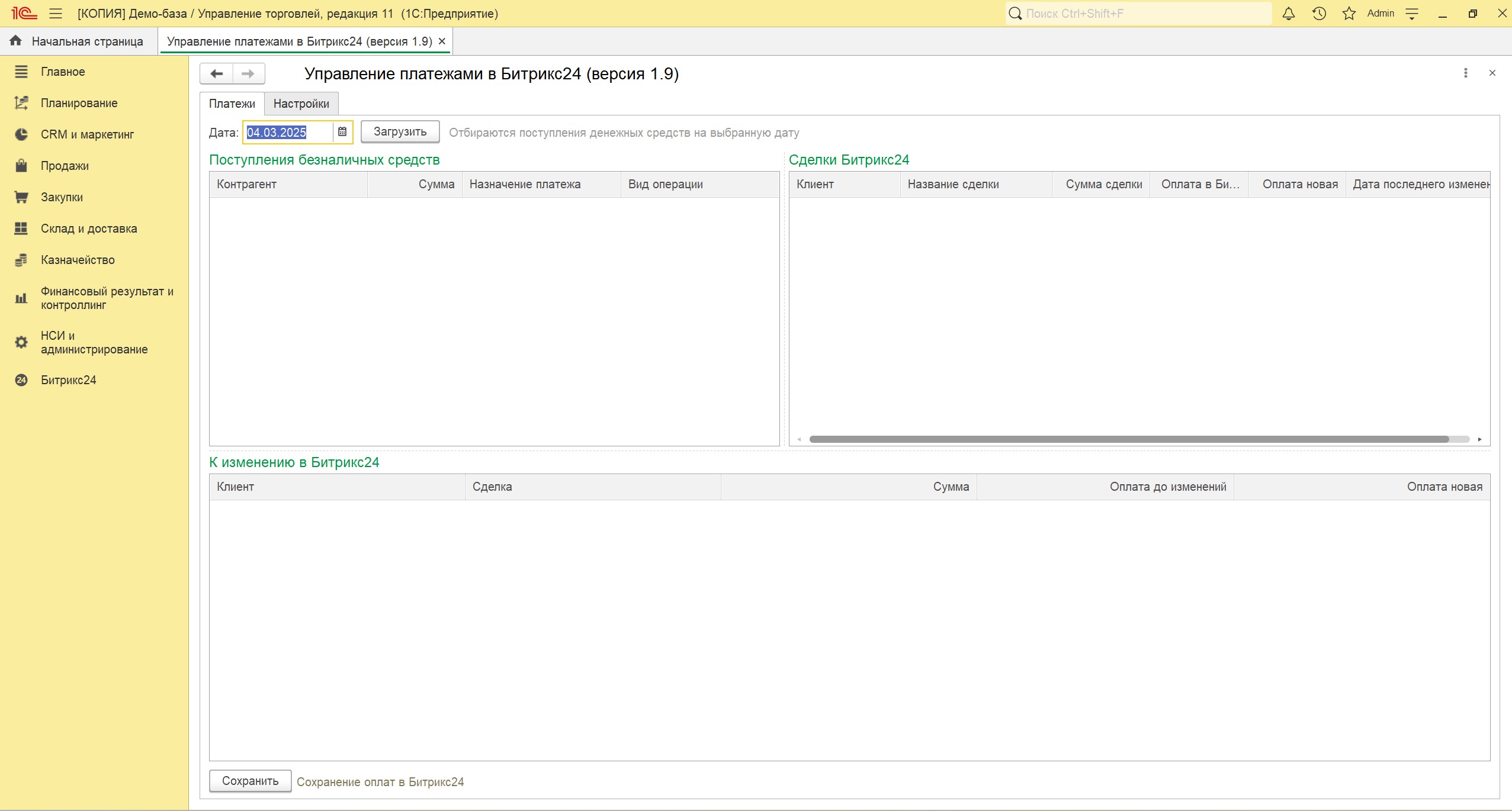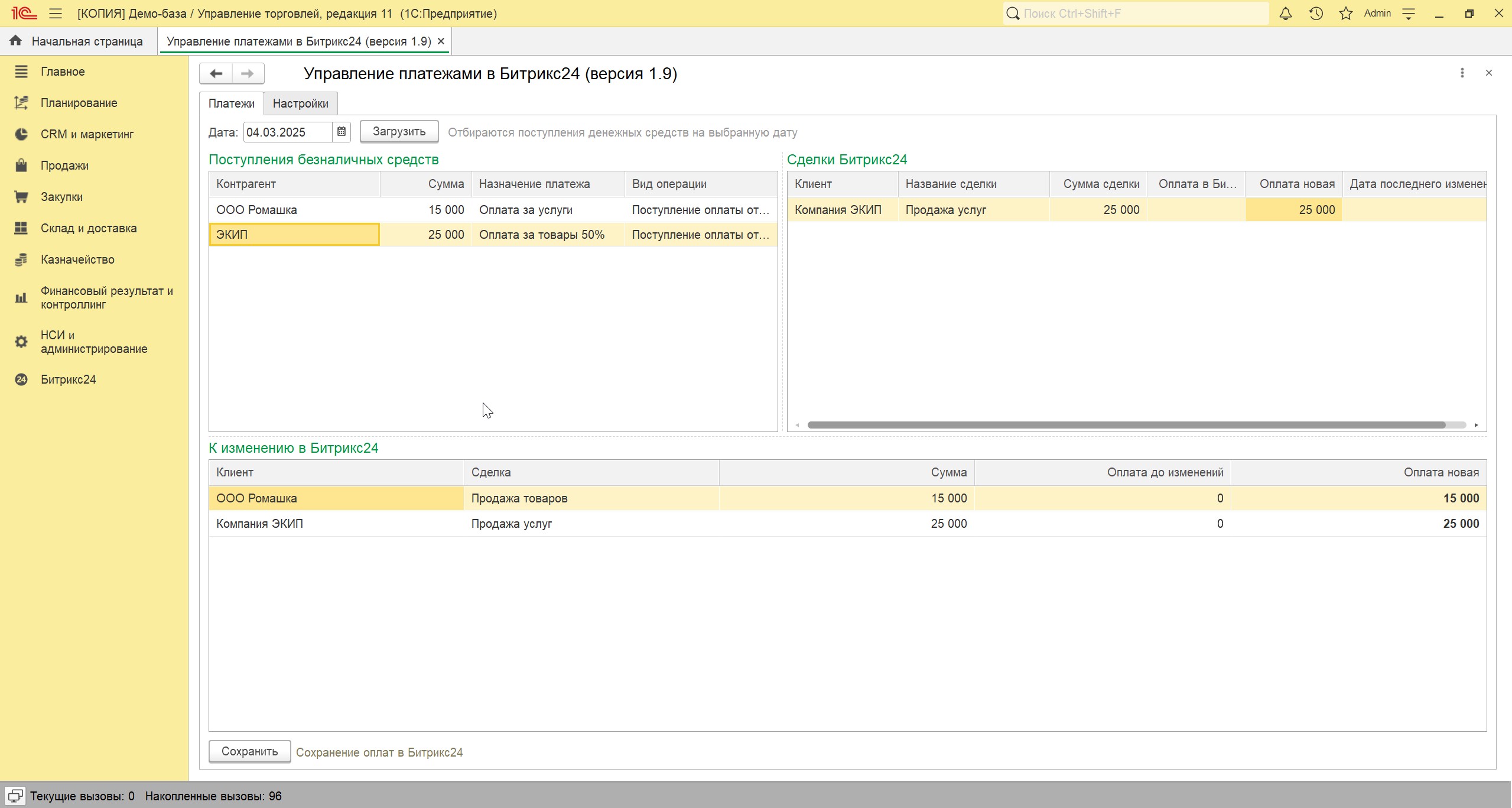 После обработки всех строк поступлений и соответствующих сделок по кнопке Сохранить значения суммы оплаты переносятся в сделки Битрикс24.