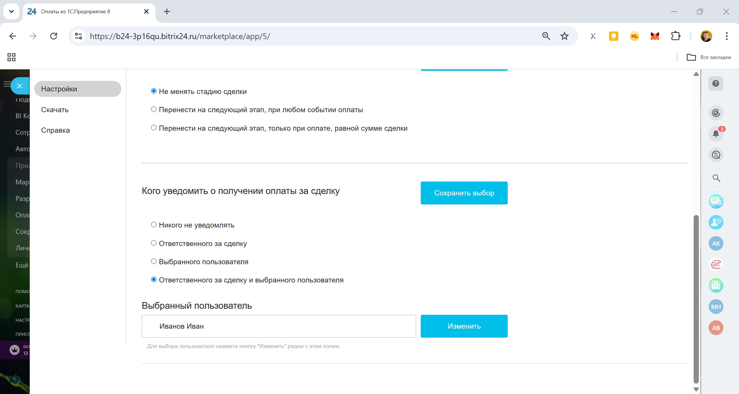Обратите внимание: выбор пользователя для получения уведомления о сделке становится доступен при выборе вариантов в блоке "Кого уведомлять о получении..." или "Выбранного пользователя", или "Ответственного за сделку и выбранного пользователя".