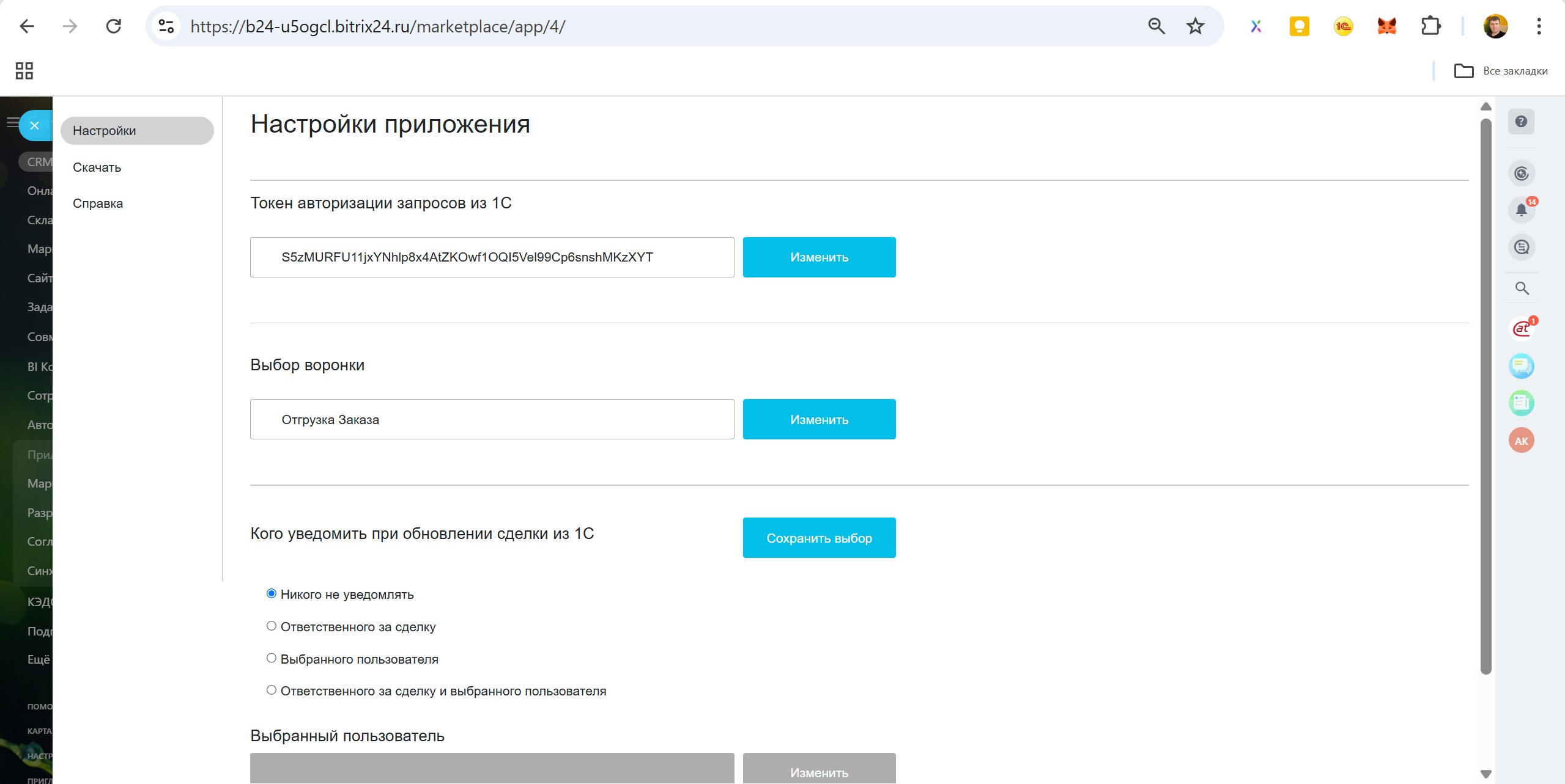 Дополнительно можно выбрать пользователя для отправки уведомления по любым изменениям в сделке при синхронизации из 1С.