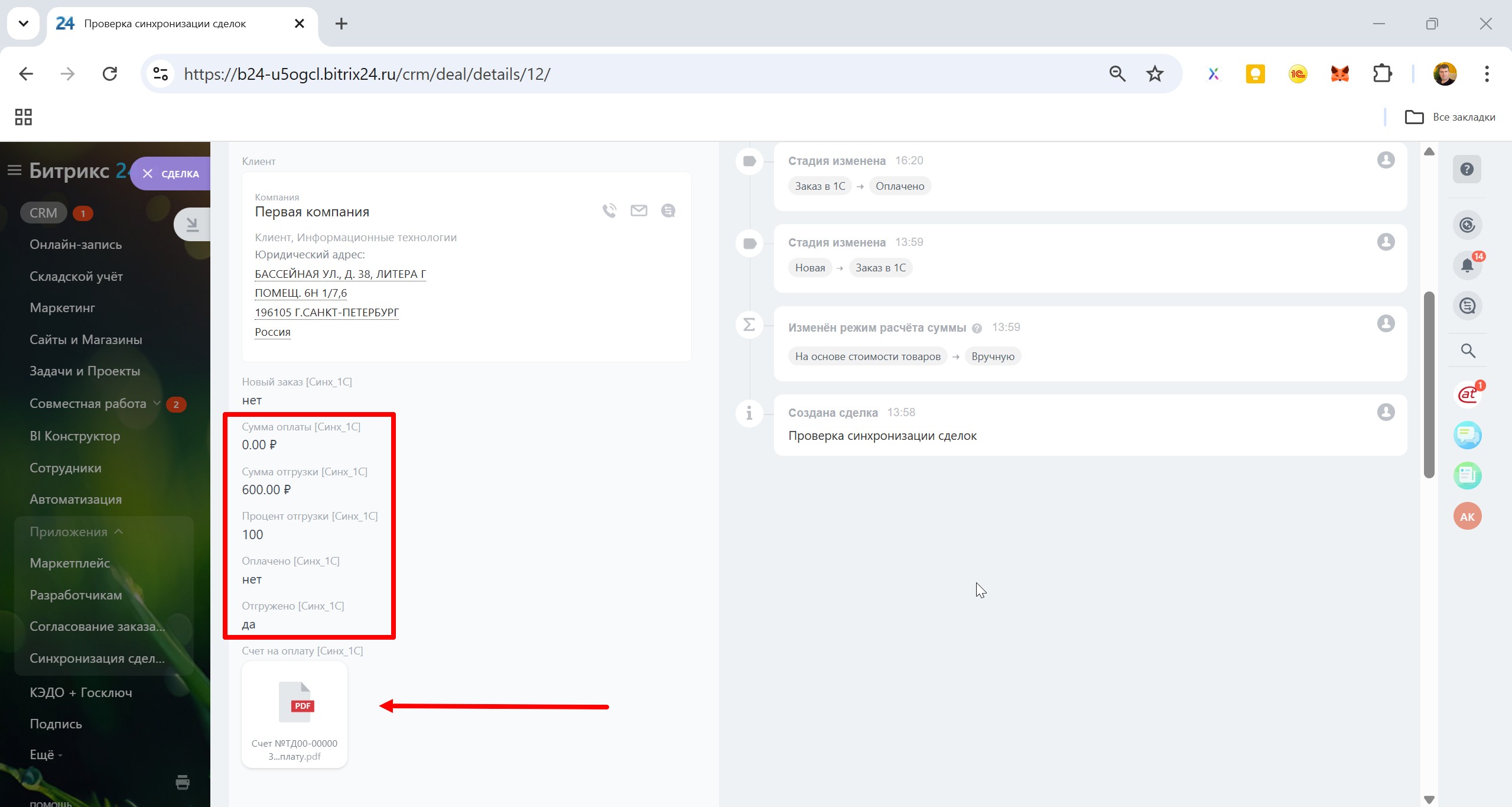 Рекомендуем вывести эти поля в карточку сделки для просмотра полученных данных из 1С.