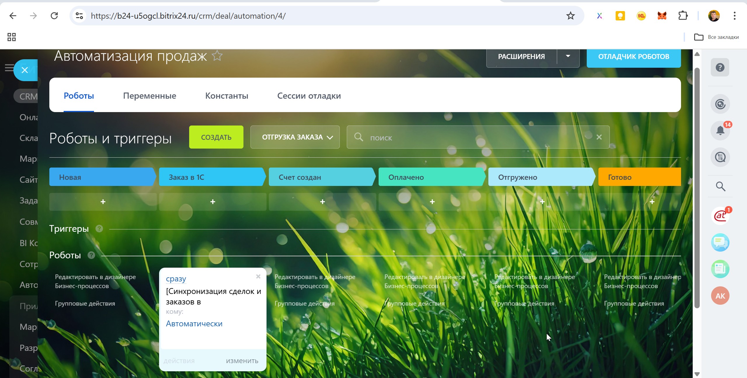 Таким образом, при смене этапа срабатывает робот и сделка отмечается признаком Новый заказ [Синх_1С].