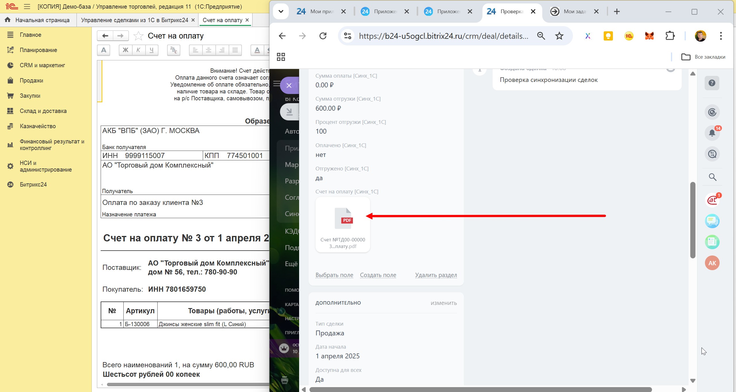 Также добавляется поле Счет на оплату [Синх_1С] для передачи печатной формы (файла) счета из 1С в сделку Битрикс24.