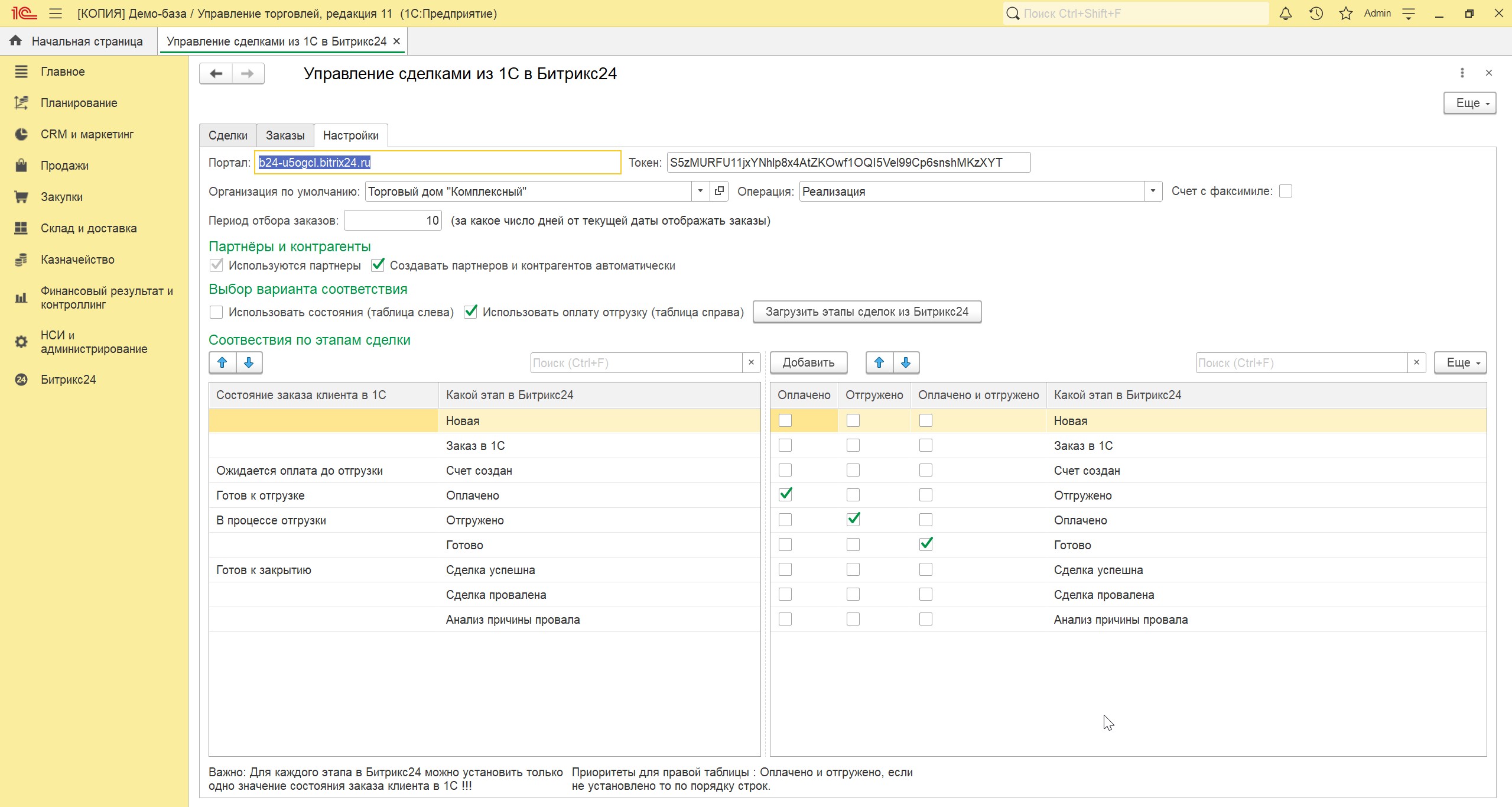В настройке вам достаточно получить токен для синхронизации данных и выбрать воронку, в которой сделки будут синхронизироваться с заказами клиентов в 1С.