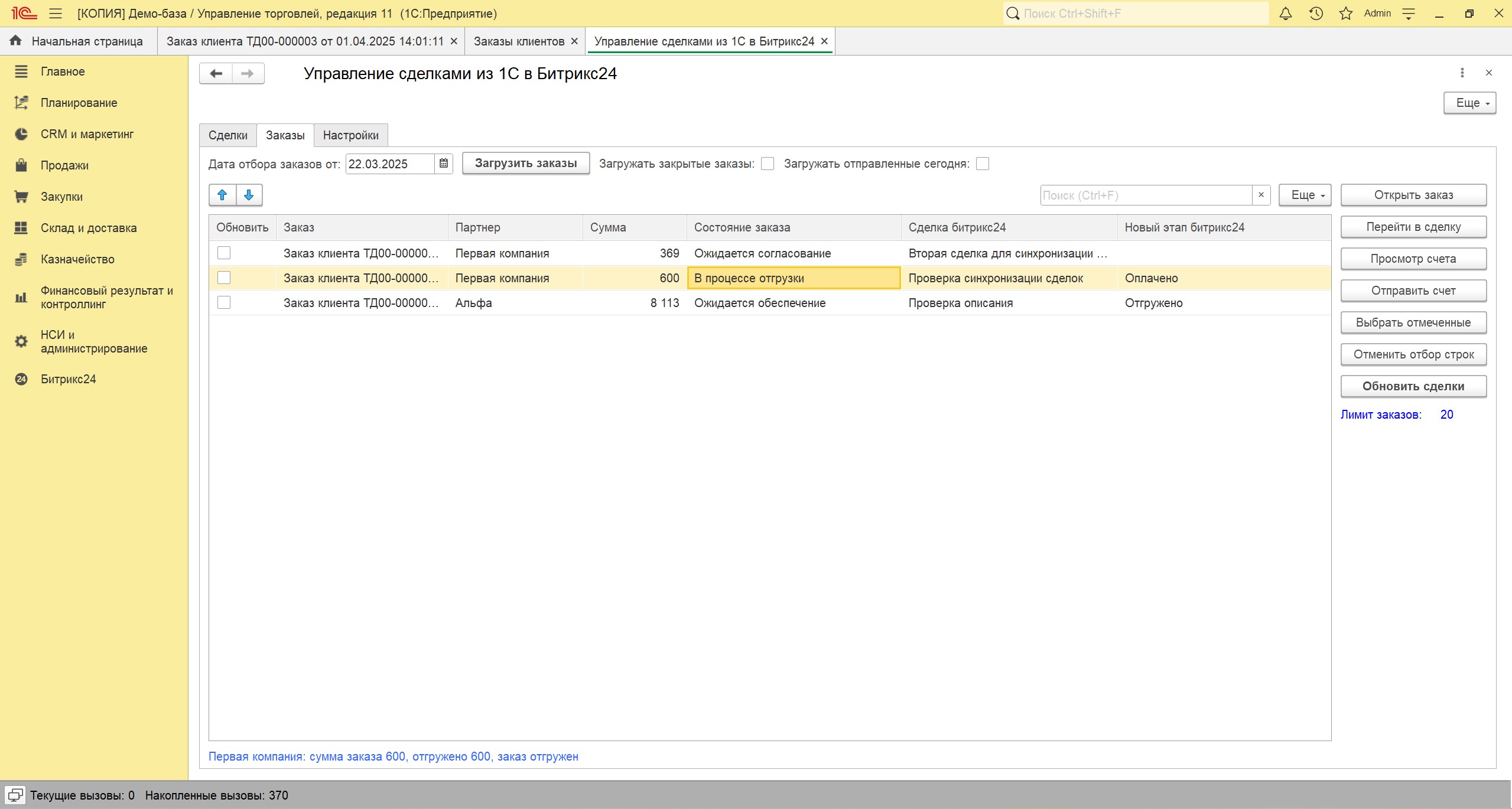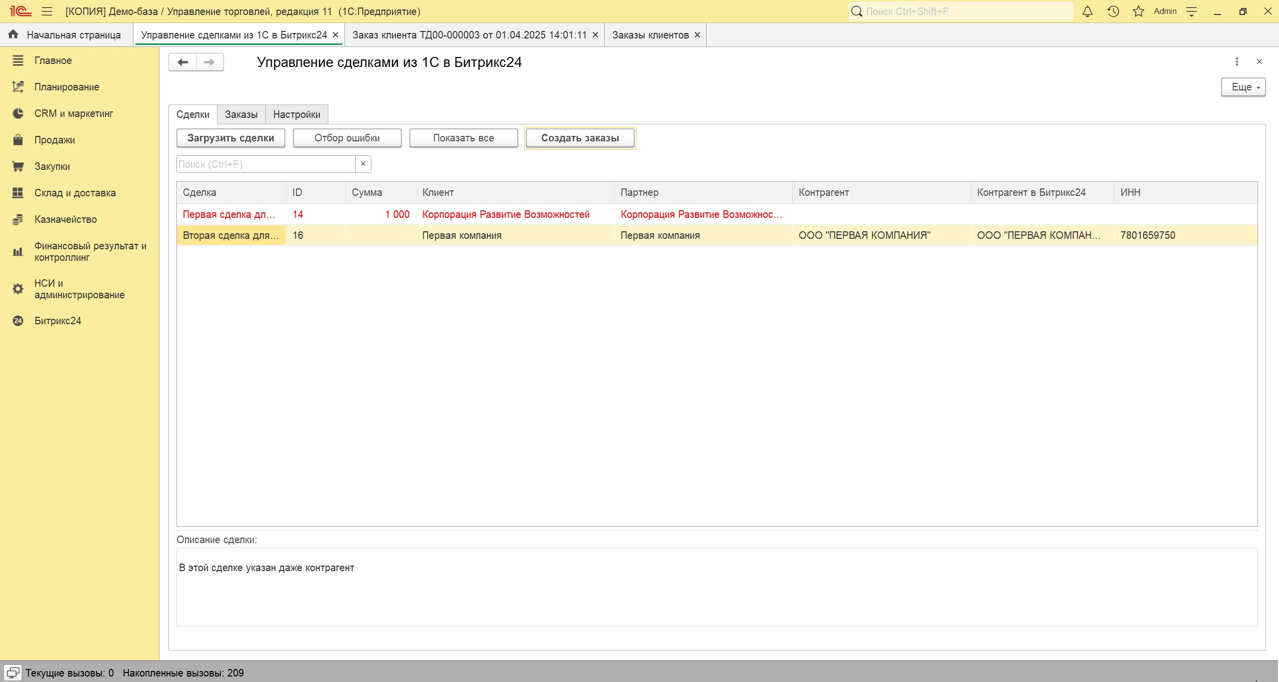 После выбора сделок для создания заказов клиентов на стороне 1С вся работа с данными происходит на стороне 1С.