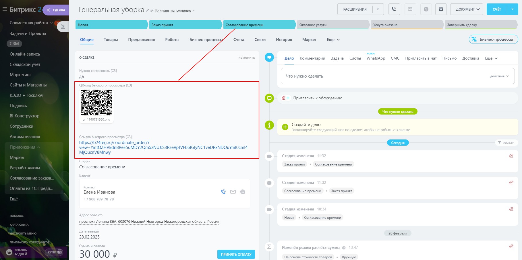 Для этого нужно настроить робота для соответствующей стадии который устанавливается с приложением и называется "[[Согласование заказа с клиентом] Создать QR-код и ссылку для быстрого просмотра [СЗ]". Именно перевод на данную стадию инициирует добавление полей QR и Быстрая ссылка: