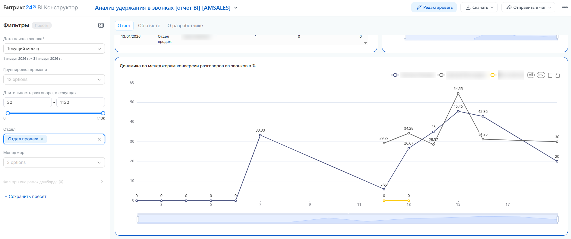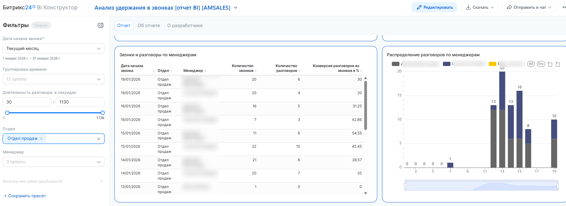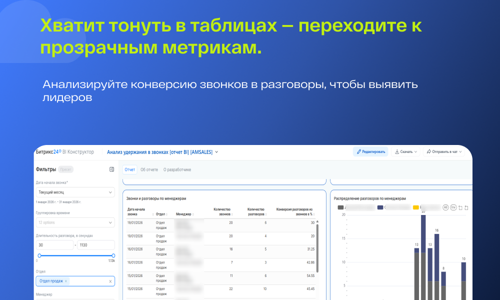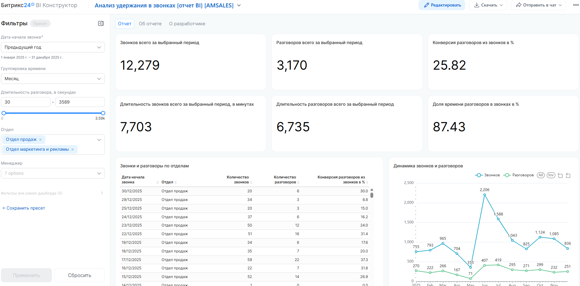 Суть решения: Инструмент аналитики телефонии, который отделяет технический поток звонков от реальных коммуникаций. Отчет позволяет сфокусироваться на «целевых разговорах» — звонках, длительность которых подтверждает факт качественного контакта с клиентом.
