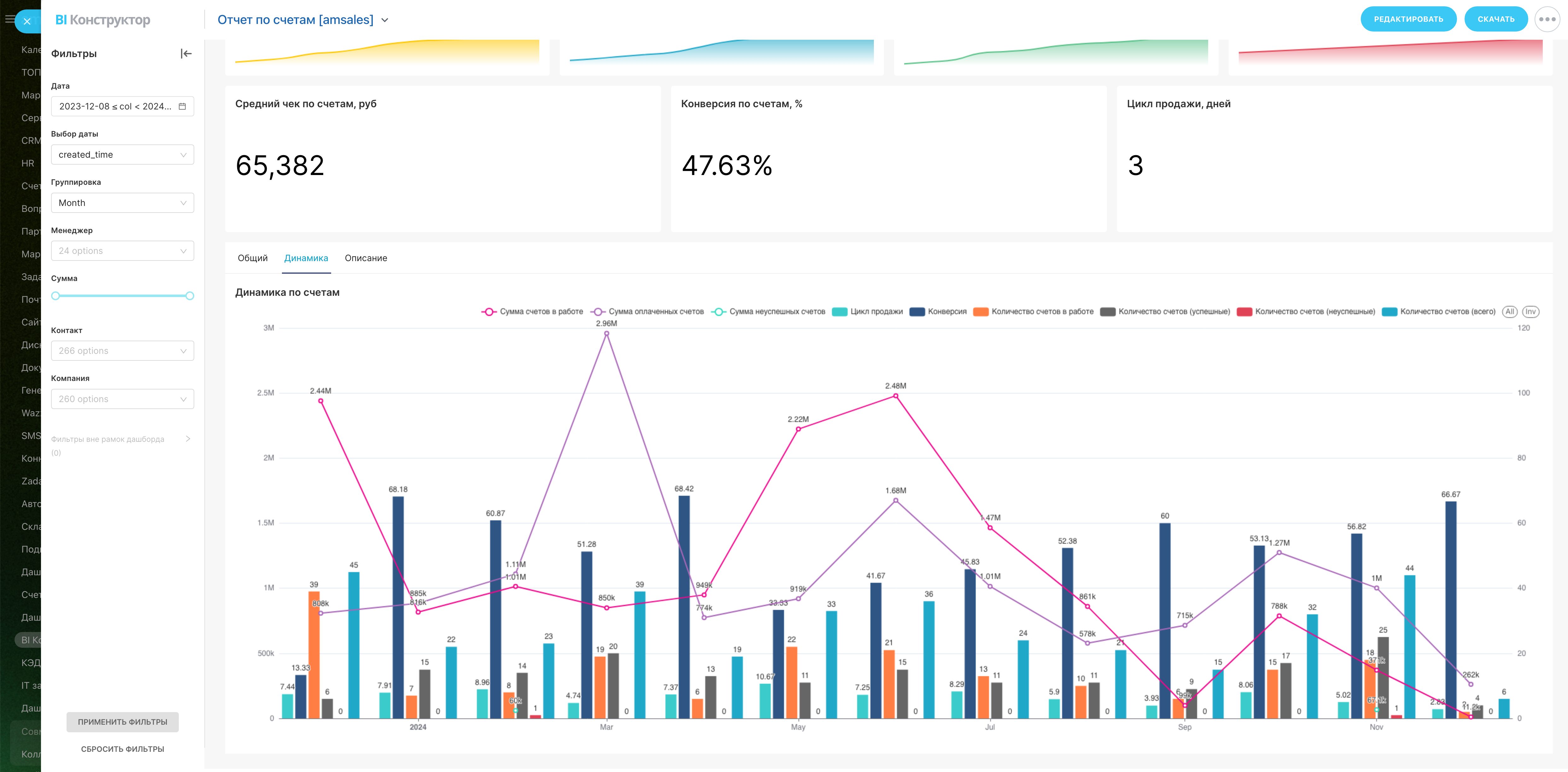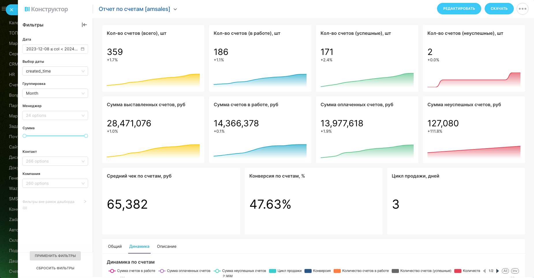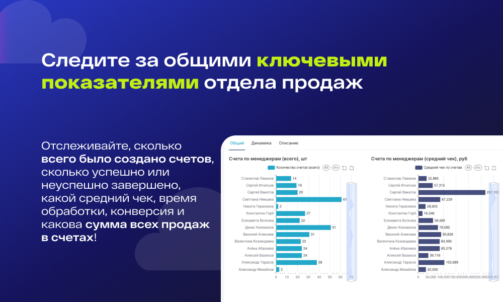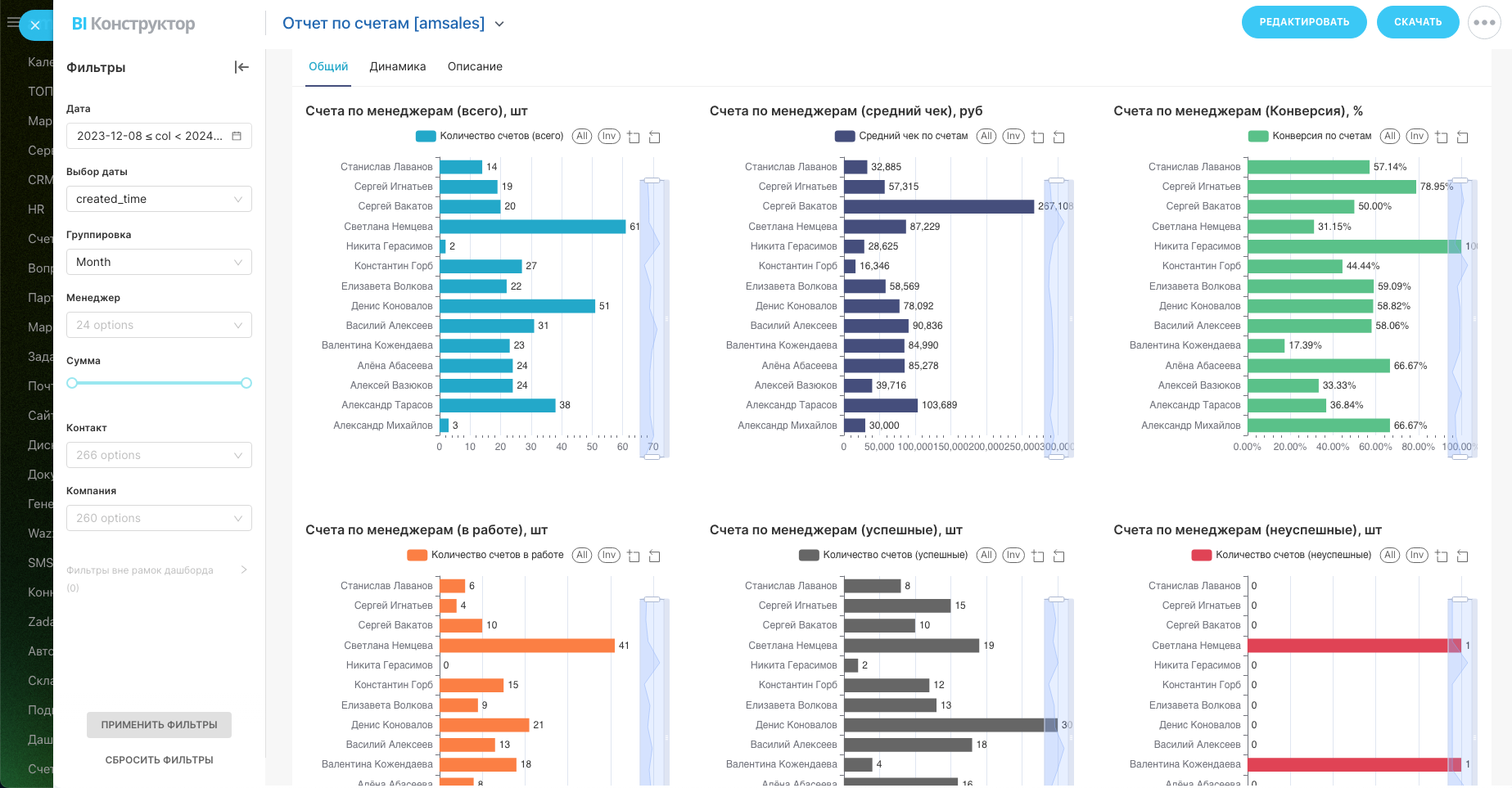 Полная аналитика по счетам и продажам: динамика, долги, эффективность менеджеров и многое другое. Установите прямо сейчас и выводите свой бизнес на новый уровень!