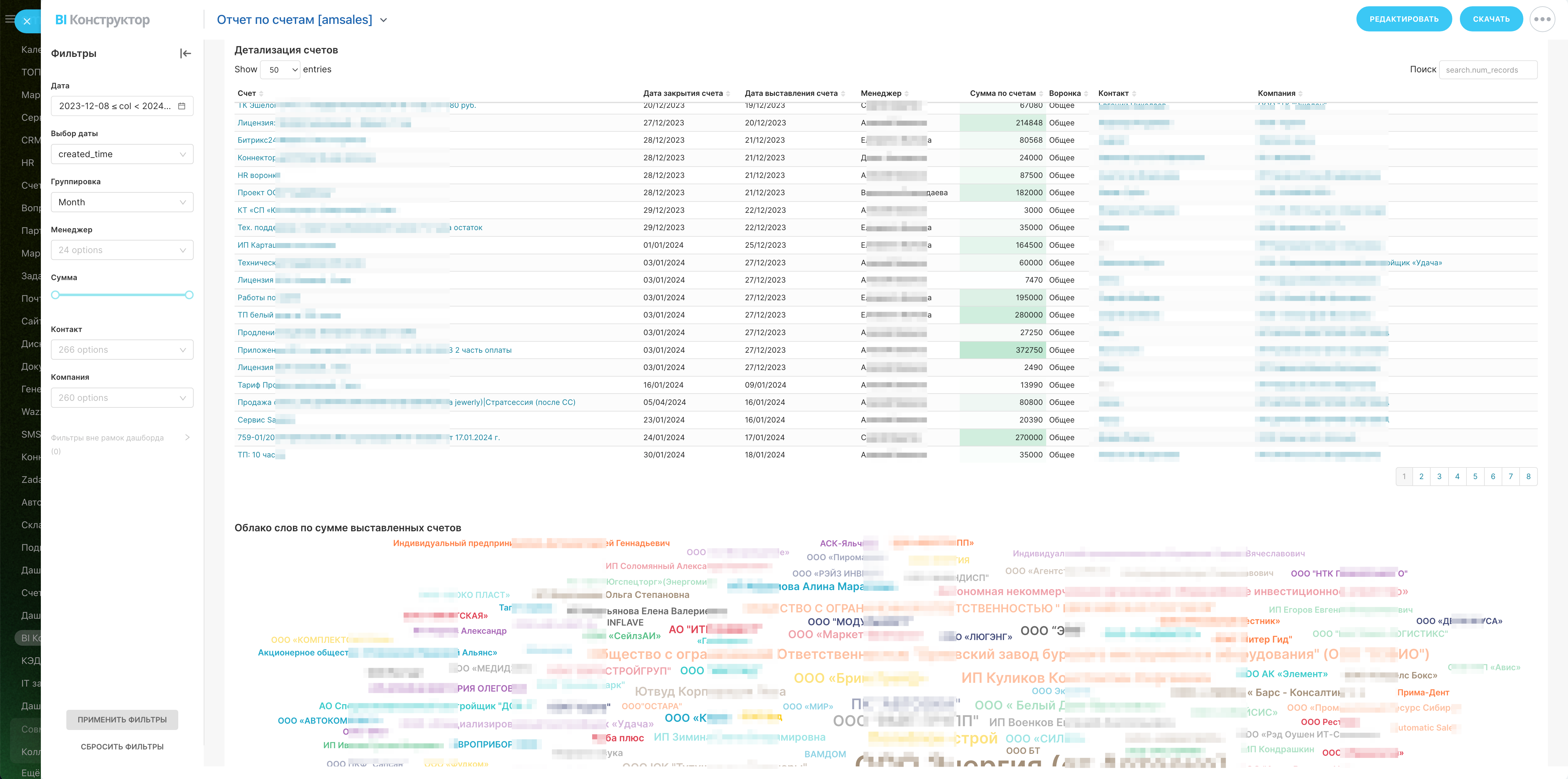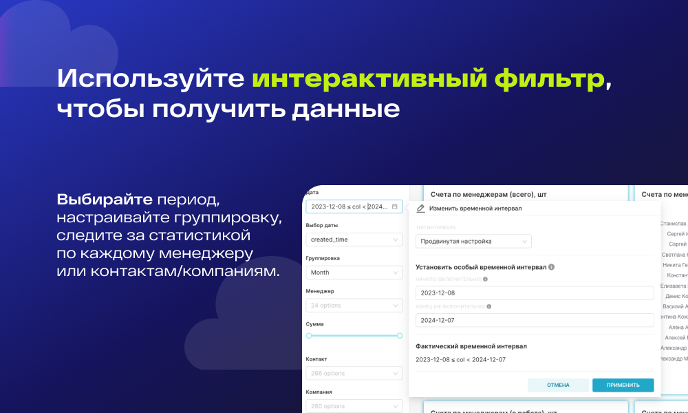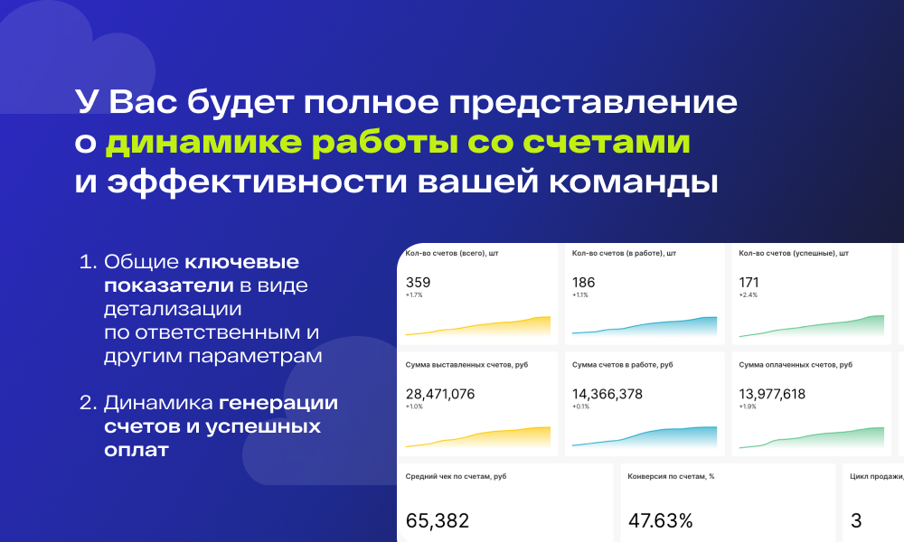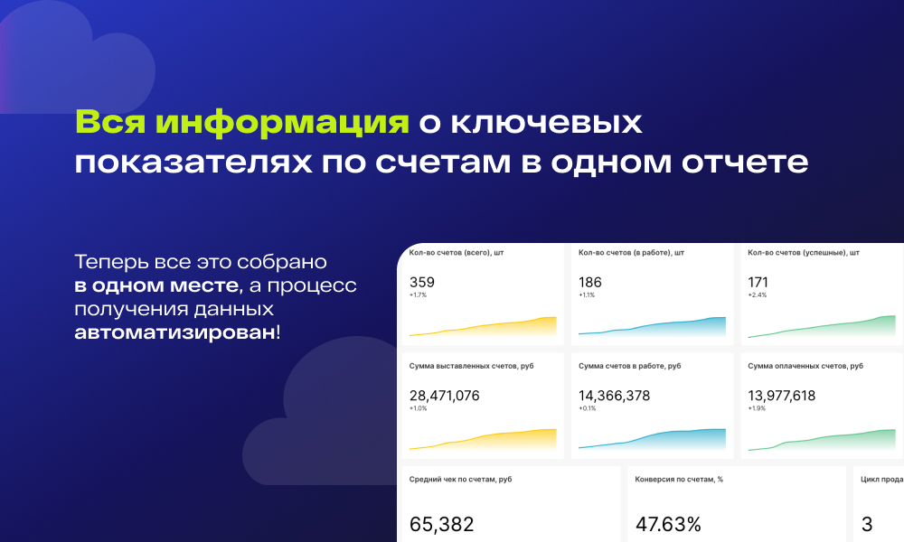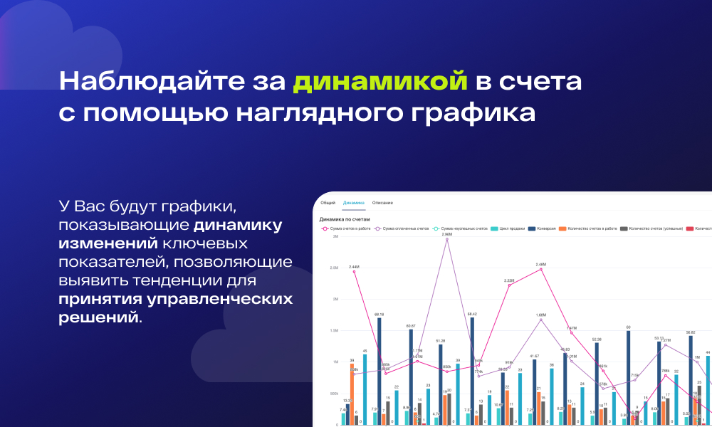 Полная аналитика по счетам и продажам: динамика, долги, эффективность менеджеров и многое другое. Установите прямо сейчас и выводите свой бизнес на новый уровень!