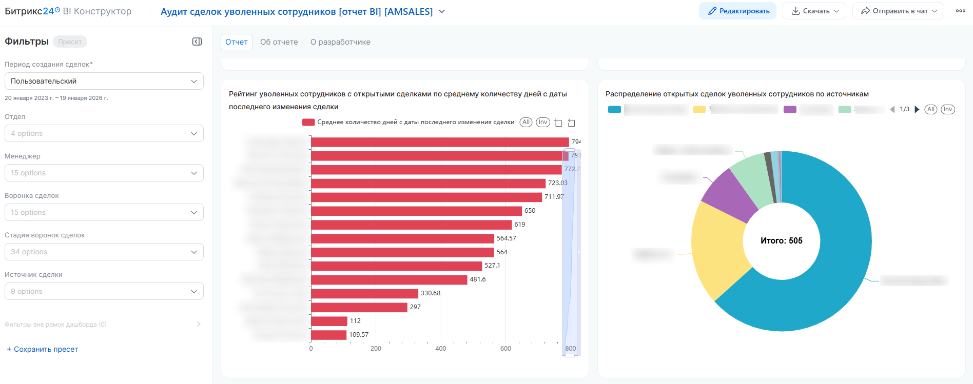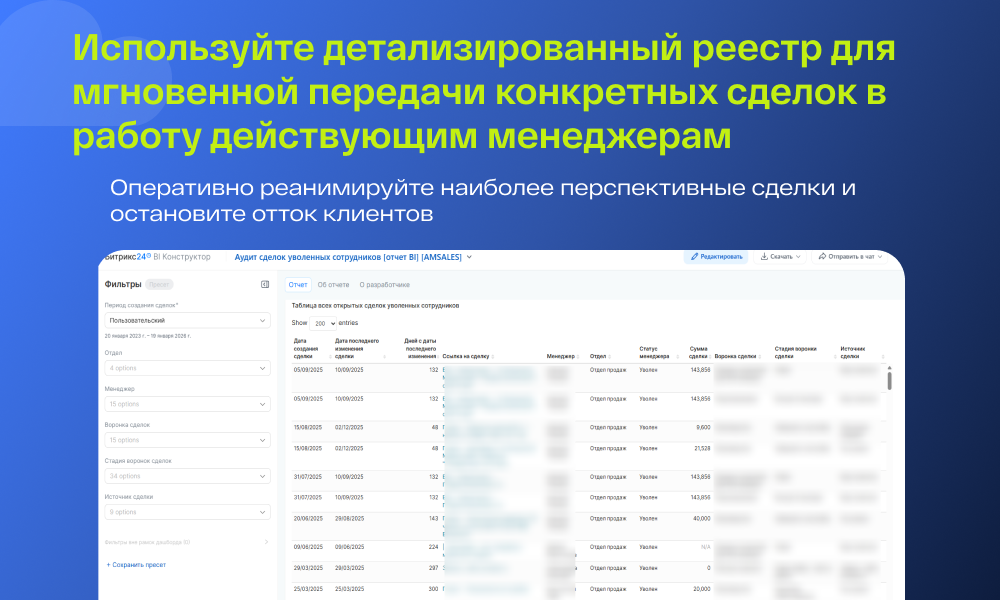 Логика формирования данных: Отчет строится на основе пересечения данных модуля CRM и структуры компании. В расчет принимаются только те сделки, ответственные за которые деактивированы. Особенностью является интерактивность: отчет содержит прямые ссылки на CRM, что позволяет мгновенно переходить из аналитического интерфейса в карточку сделки Bitrix24 для смены ответственного.