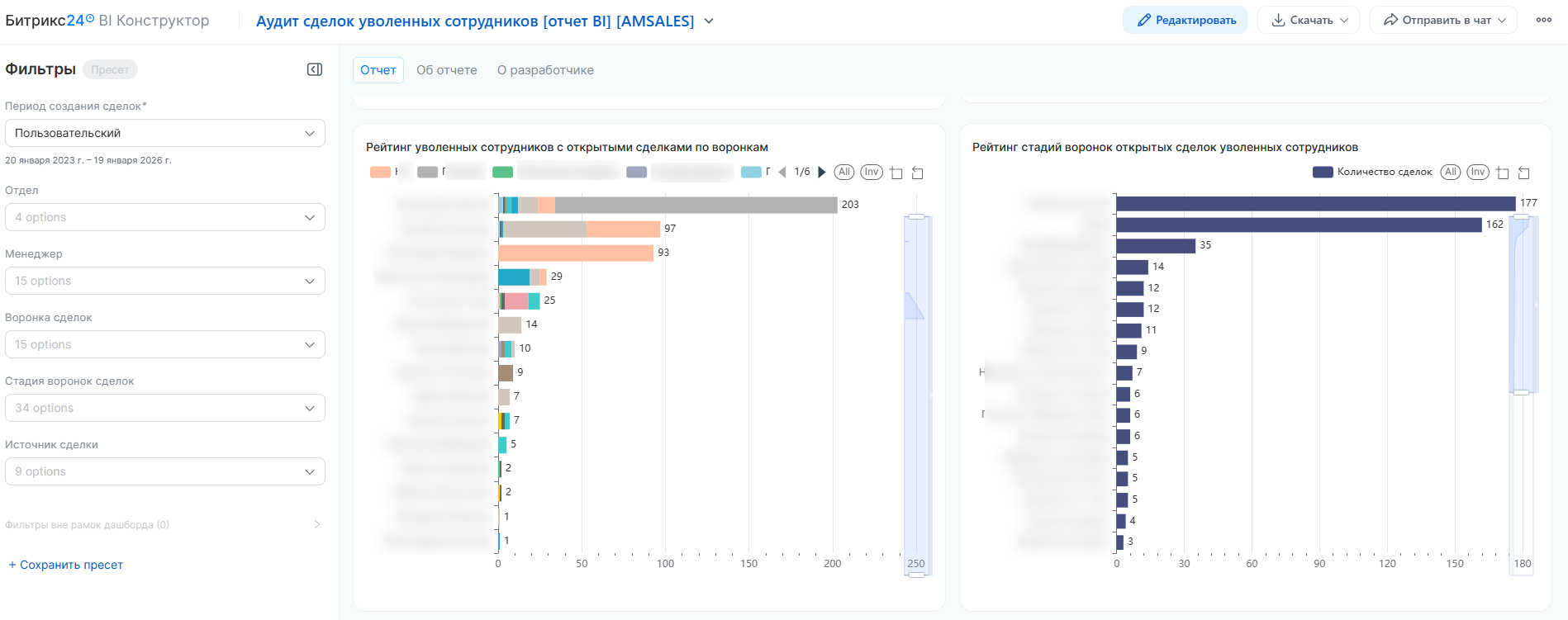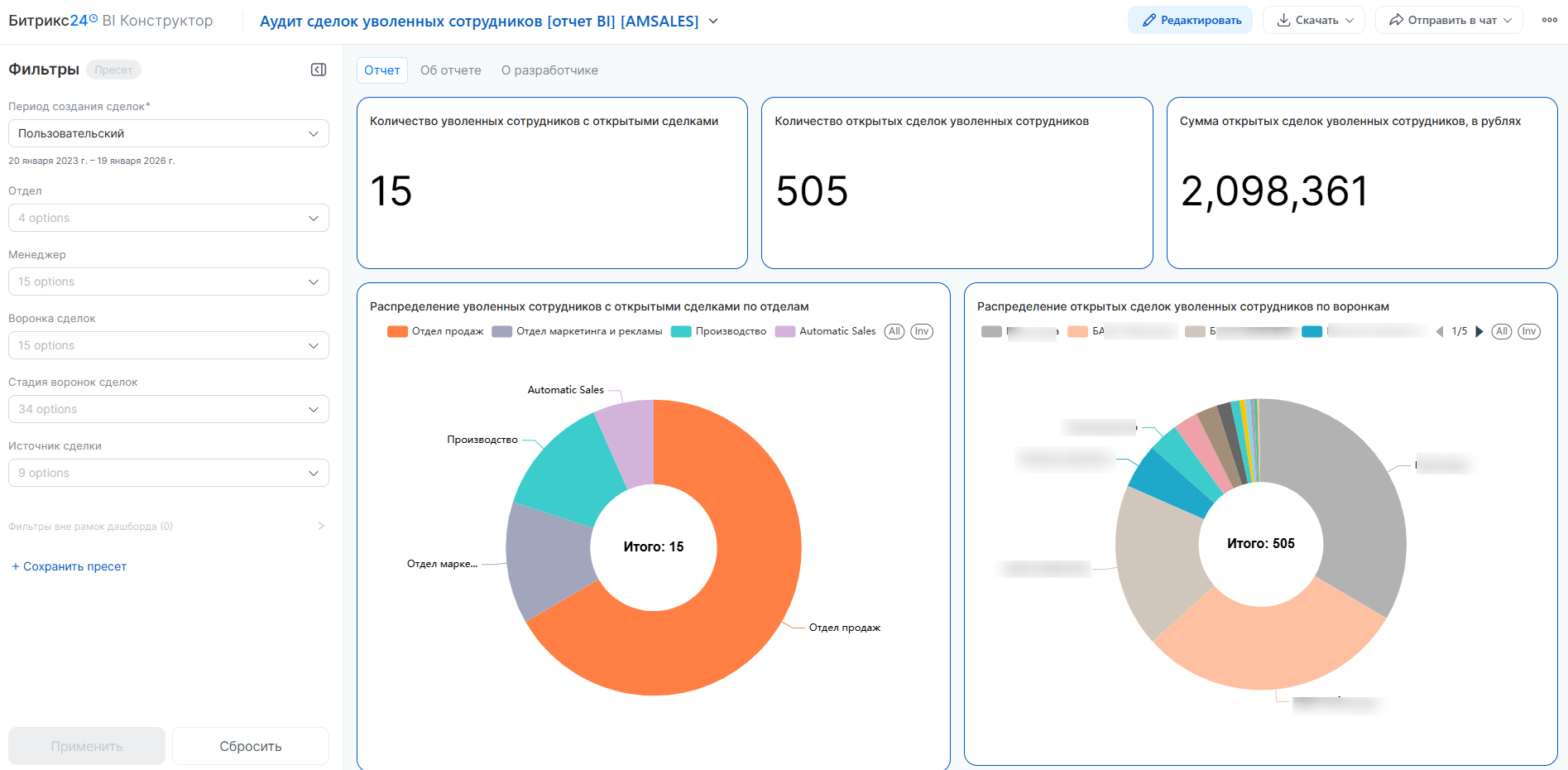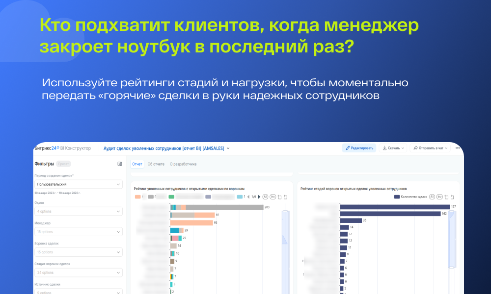 Сквозная фильтрация: Ограничение данных по периодам, воронкам, стадиям и конкретным департаментам для точечной работы с базой.