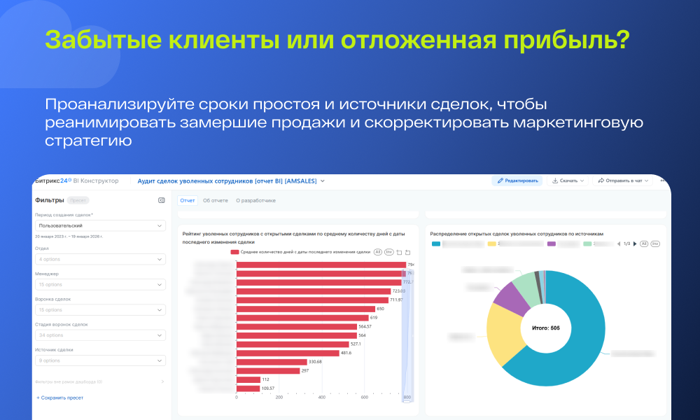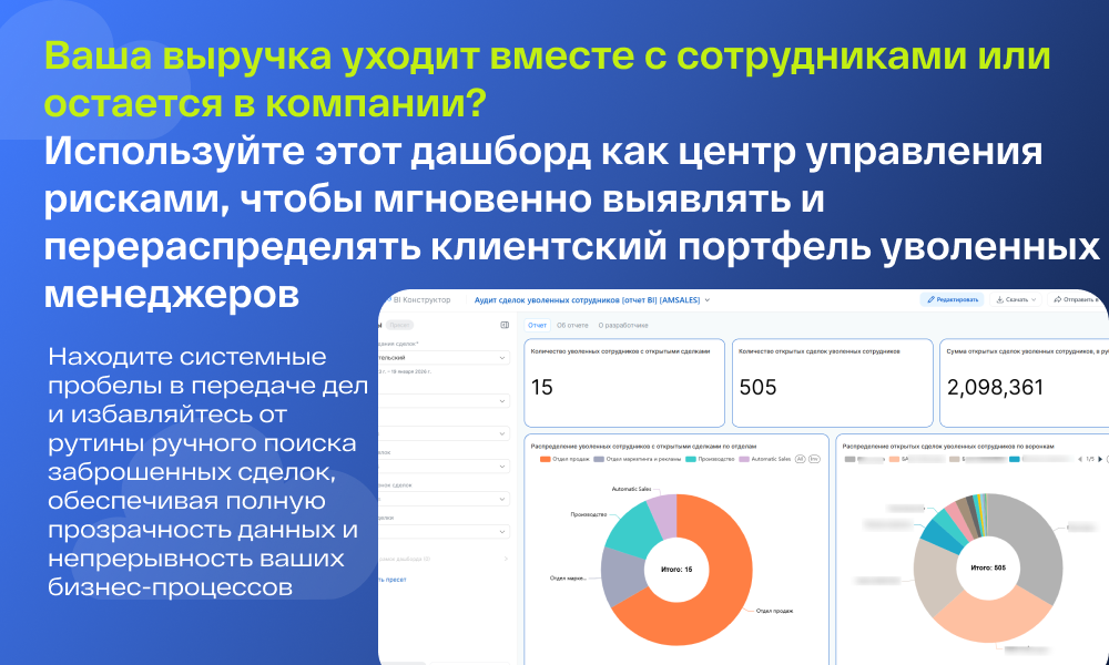 Назначение отчета: Инструмент предназначен для оперативного контроля и управления «брошенной» клиентской базой. Отчет аккумулирует данные о сделках, которые на текущий момент не закрыты (CLOSED = 'N'), но закреплены за пользователями, имеющими статус «Уволен» в системе (ACTIVE = 'N'). Он позволяет руководителям своевременно обнаружить и перераспределить активные сделки, которые остались закреплены за сотрудниками, уже прекратившими работу в компании.