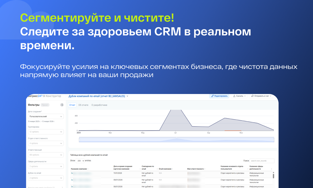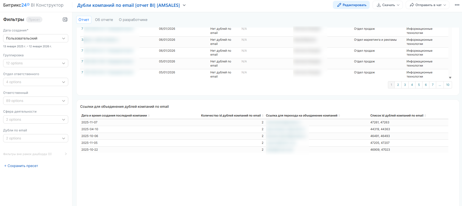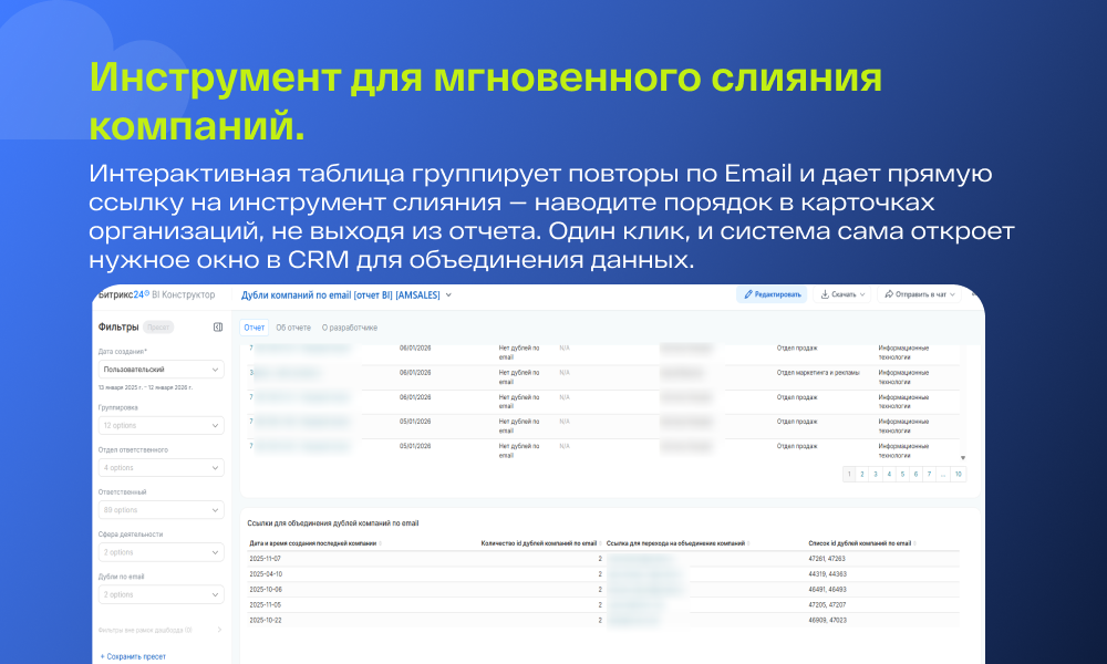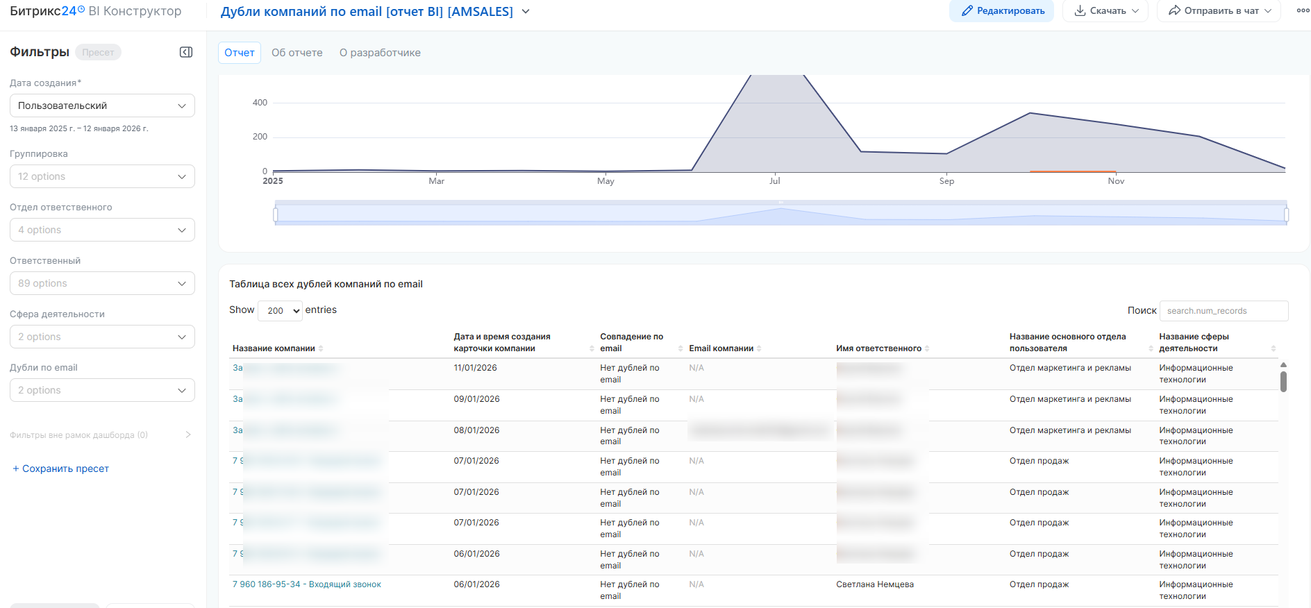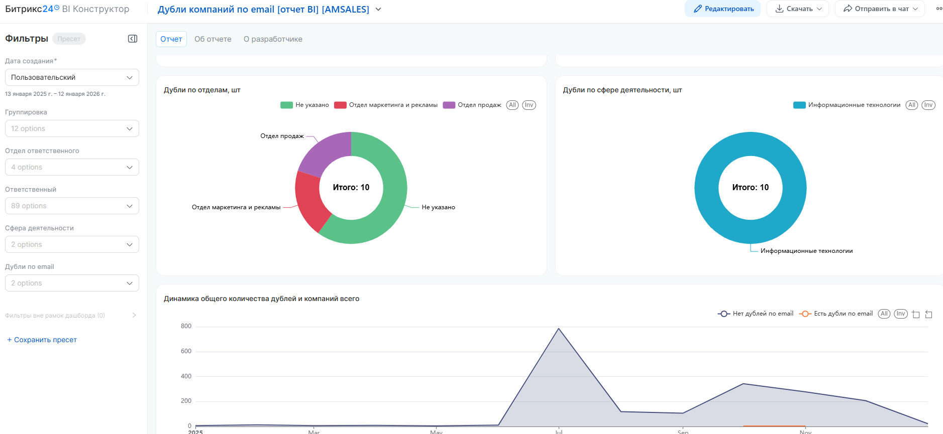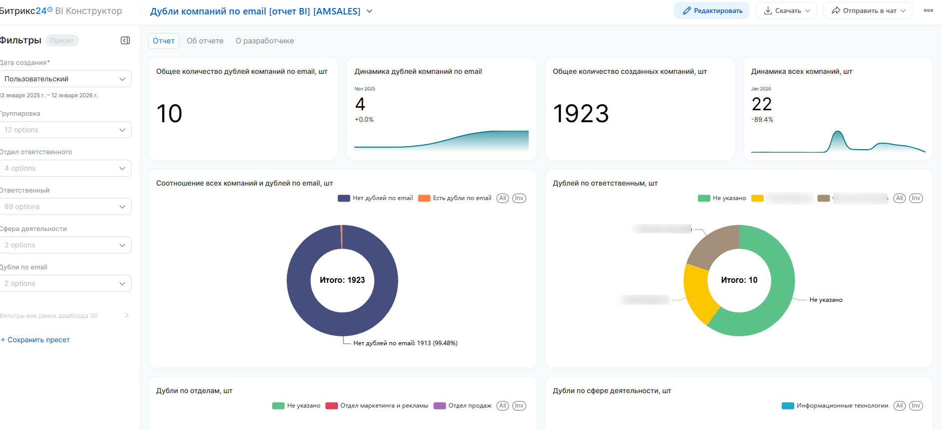 Решение: Контроль чистоты данныхНаш BI-отчет для Битрикс24 — это эффективный инструмент для наведения порядка в CRM. Он решает проблему дублирования компаний по ключевому уникальному признаку — Email-адресу.