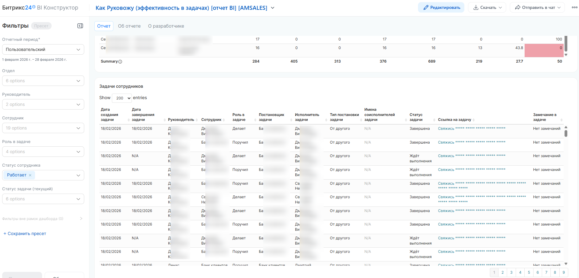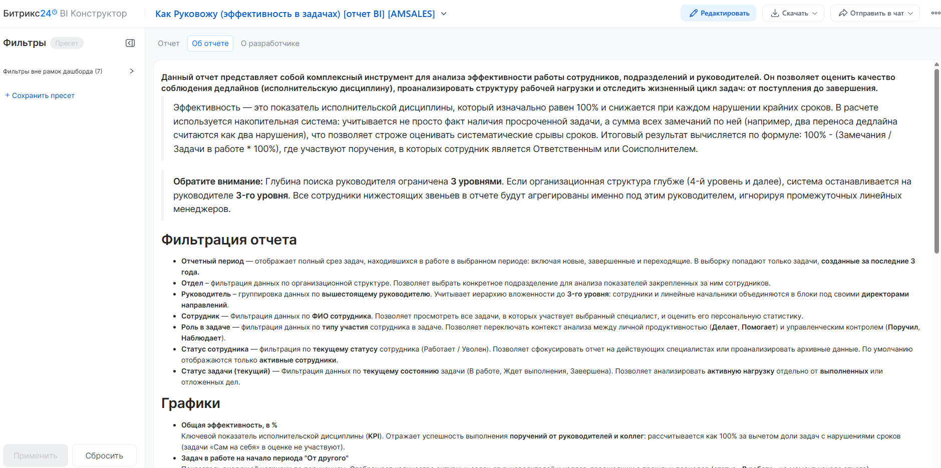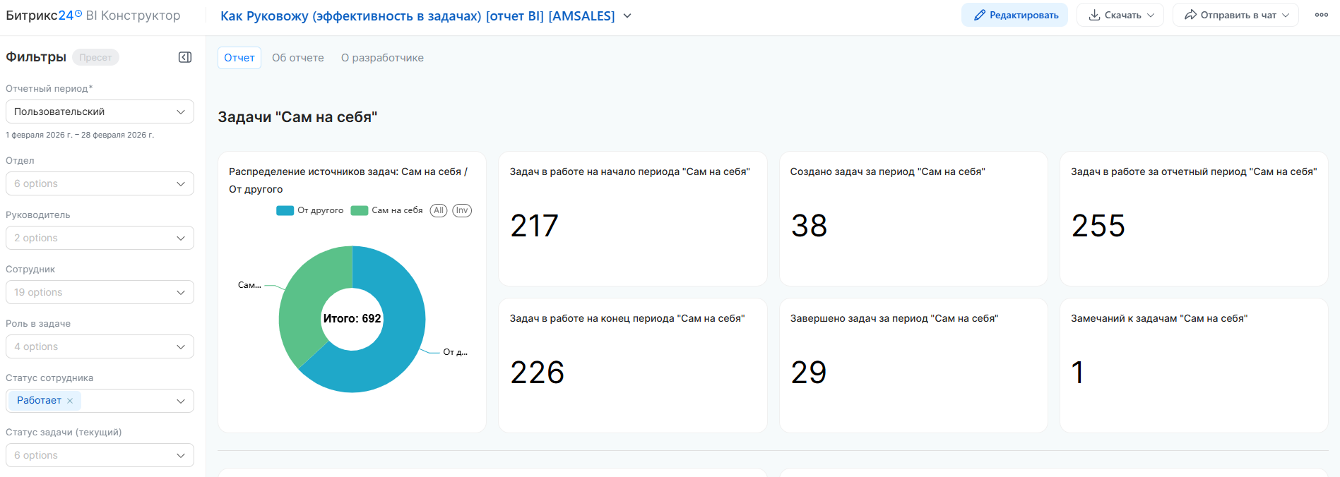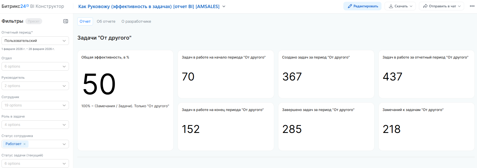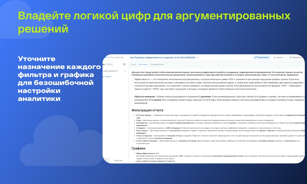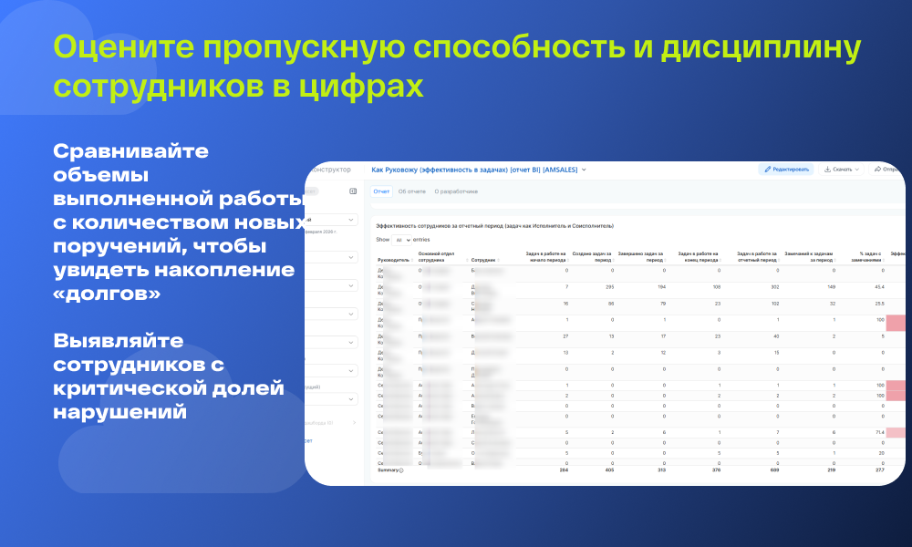Данный отчет представляет собой комплексный инструмент для анализа эффективности работы сотрудников, подразделений и руководителей. Он позволяет оценить качество соблюдения дедлайнов (исполнительскую дисциплину), проанализировать структуру рабочей нагрузки и отследить жизненный цикл задач: от поступления до завершения.