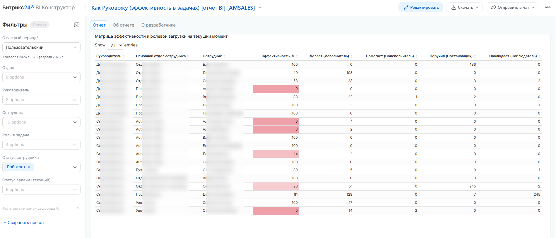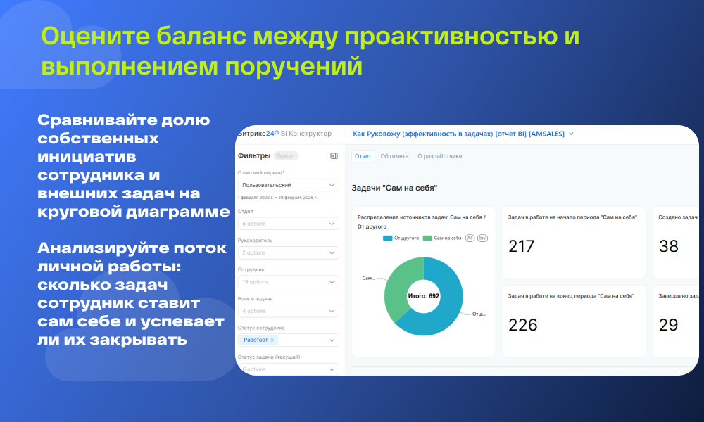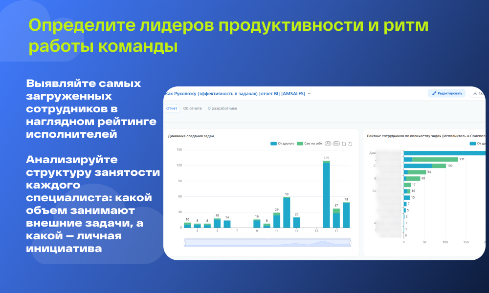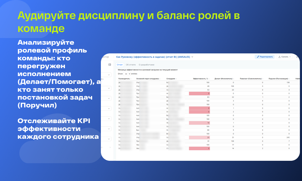 Рейтинги и Матрицы: Гистограммы и сводные таблицы («Матрица эффективности») помогают выявить лидеров и отстающих, сравнить загрузку отделов и определить ролевой профиль сотрудников (кто больше исполняет, а кто — делегирует).