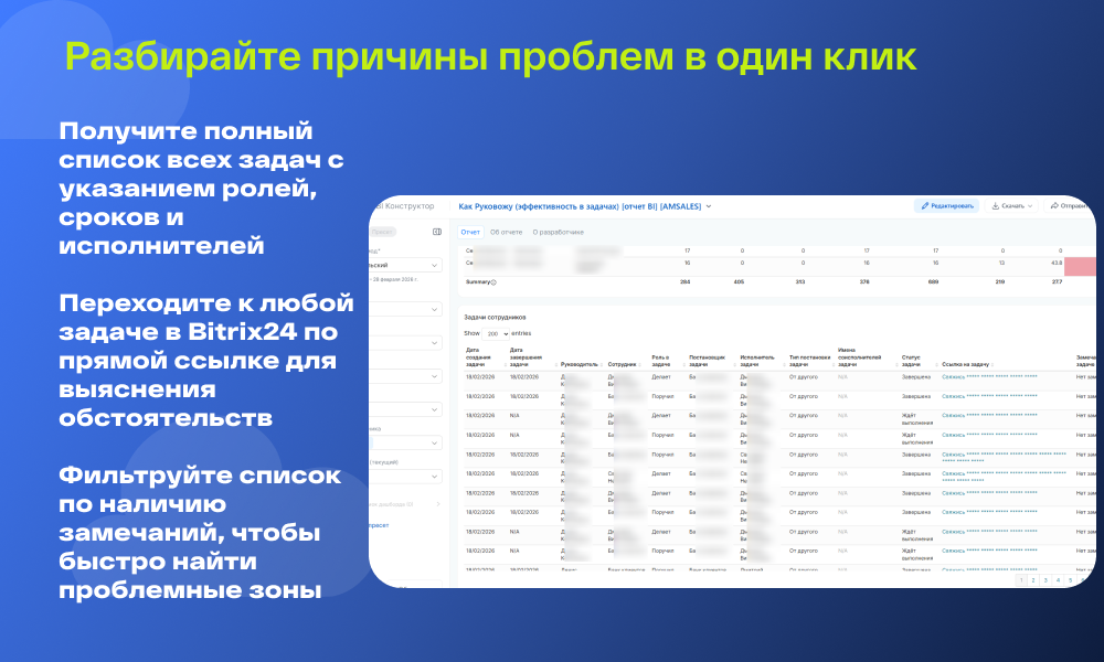 Детализация: В нижней части отчета доступны табличные реестры с возможностью перехода к конкретным задачам для детального разбора причин нарушений.