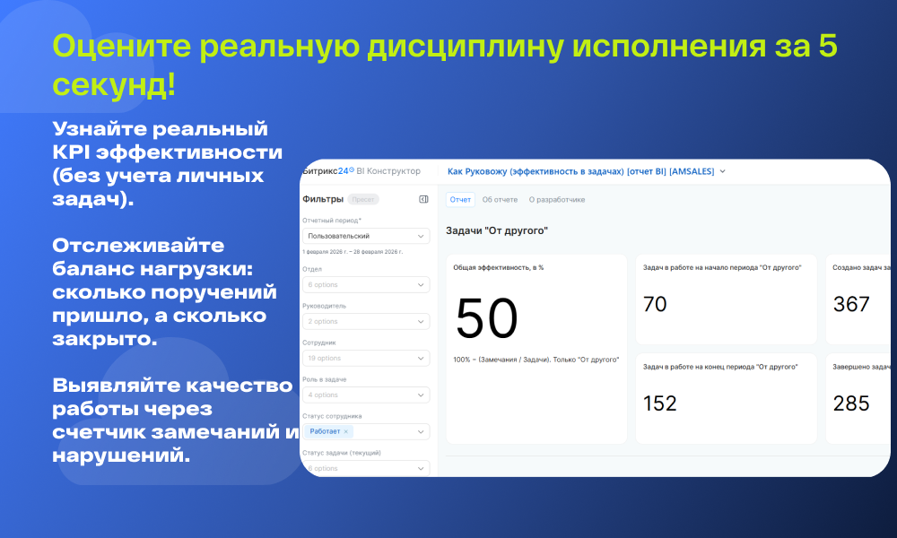 Важно: В расчете эффективности участвуют только внешние поручения (от руководителей и коллег). Задачи категории «Сам на себя» исключены из формулы KPI, чтобы фокусироваться на обязательствах перед командой.