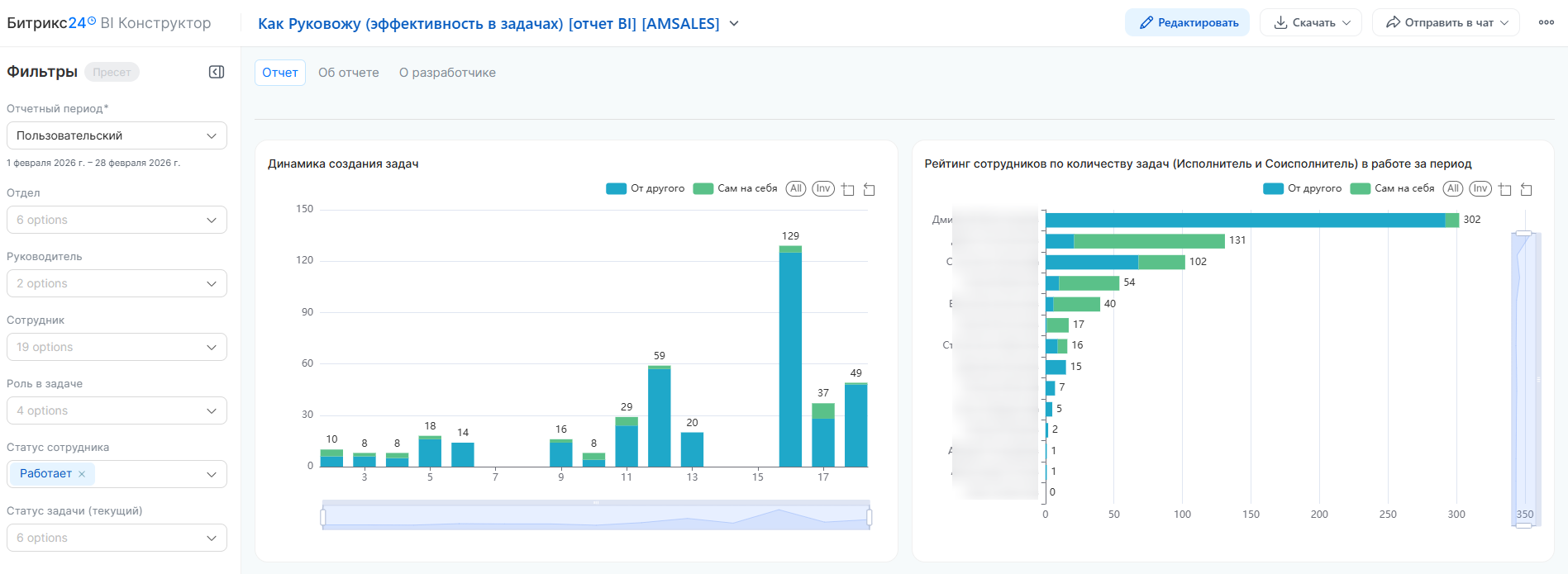 Фильтрация и контекст: Гибкая система фильтров позволяет переключать фокус анализа от глобальных показателей всей компании (за последние 3 года) до детальной статистики конкретного сотрудника, отдела или статуса задачи (в работе/завершена).