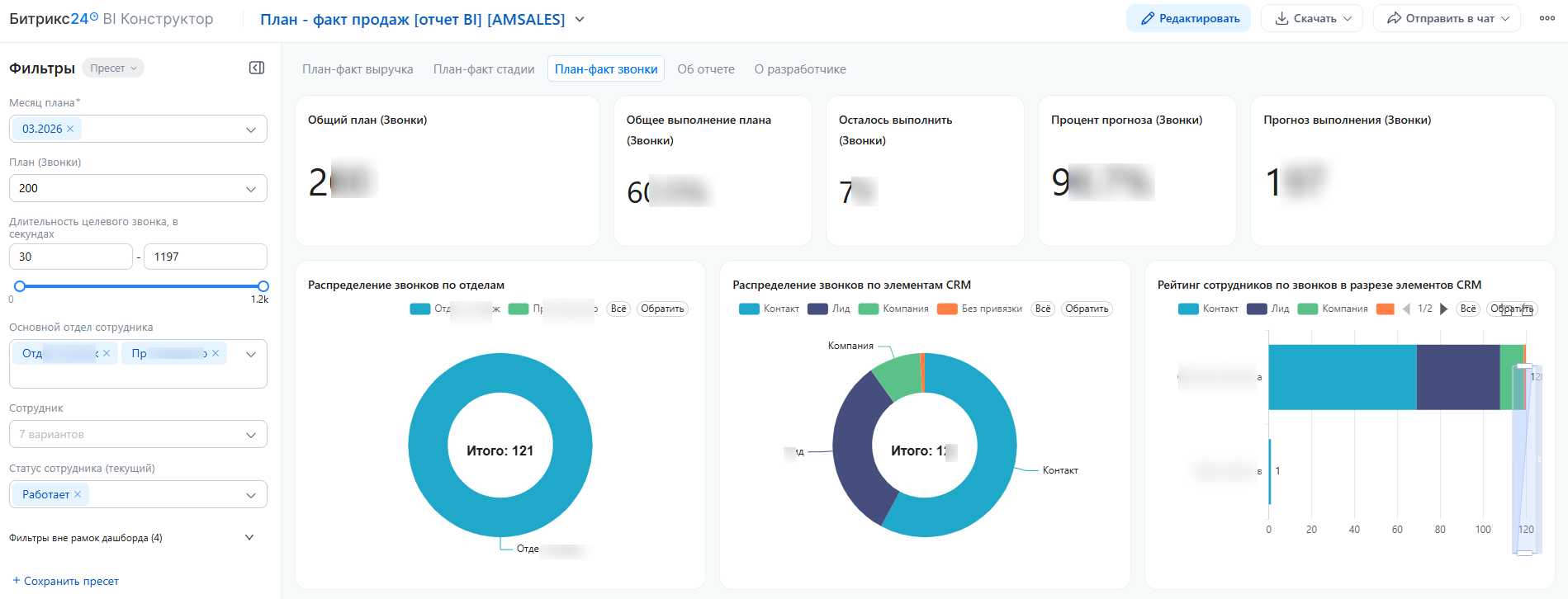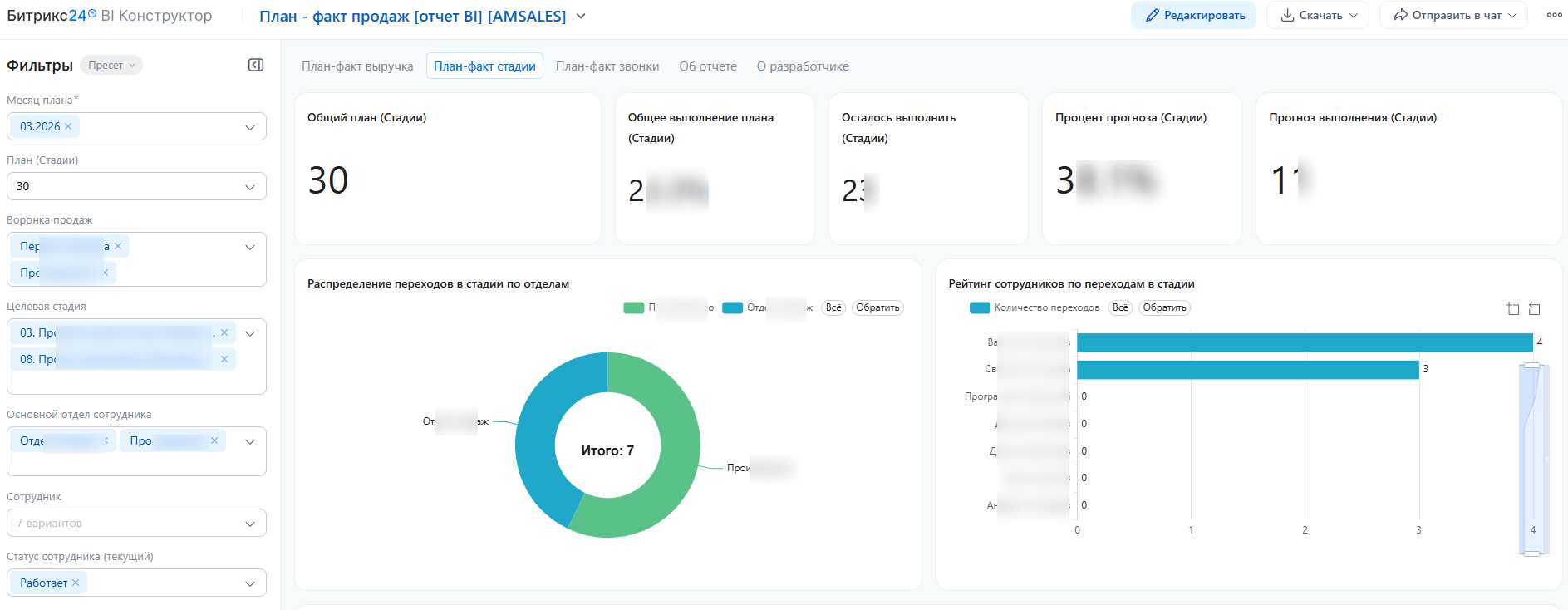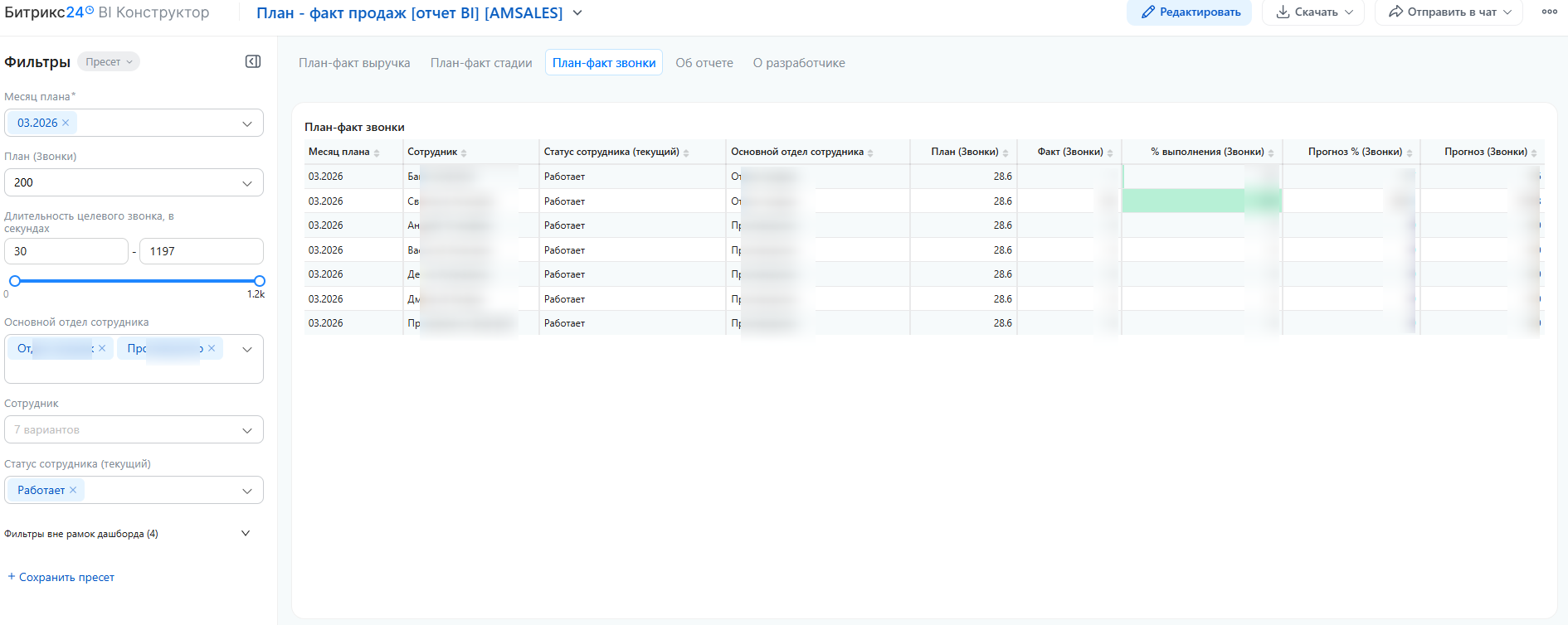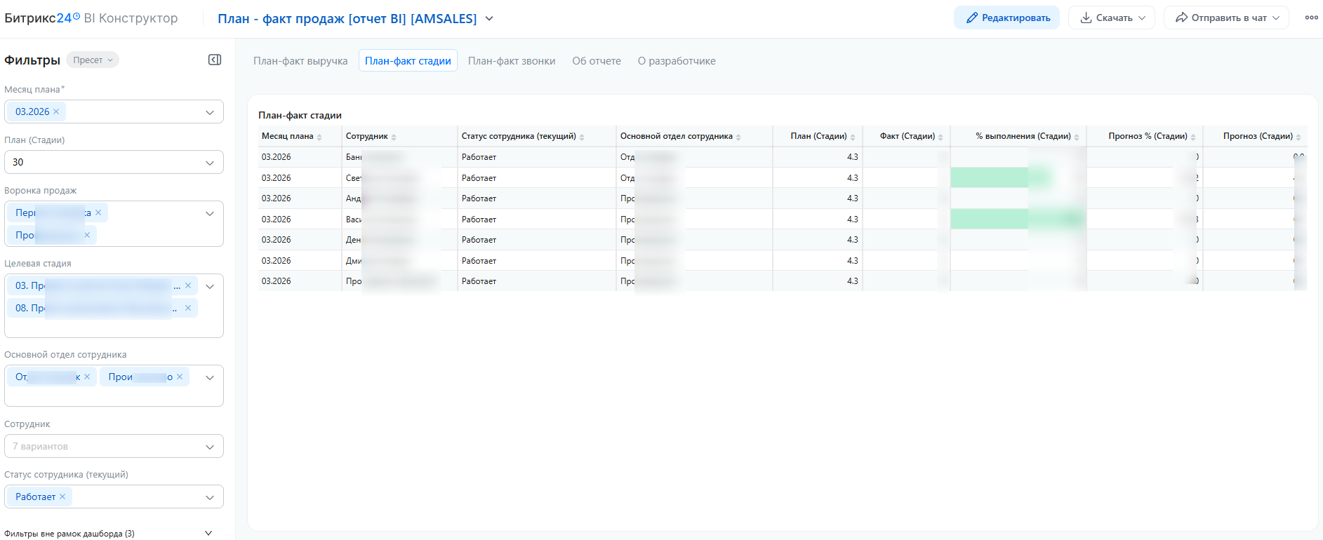 Дробные значения планов: В связи с алгоритмом деления общего плана поровну, в показателях по Стадиям и Звонкам могут возникать дробные значения (например, 3.8 звонка). Это математическая норма для данного решения.