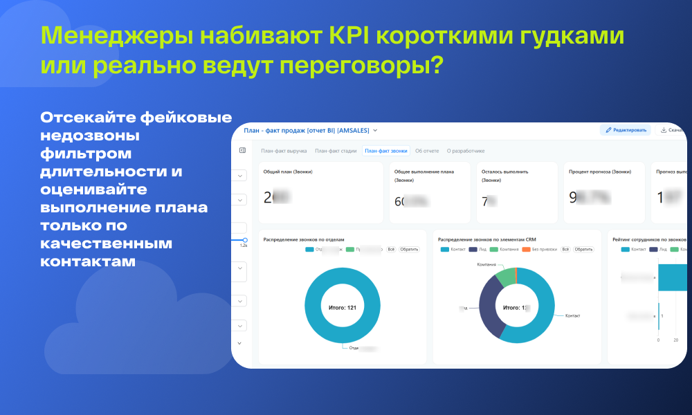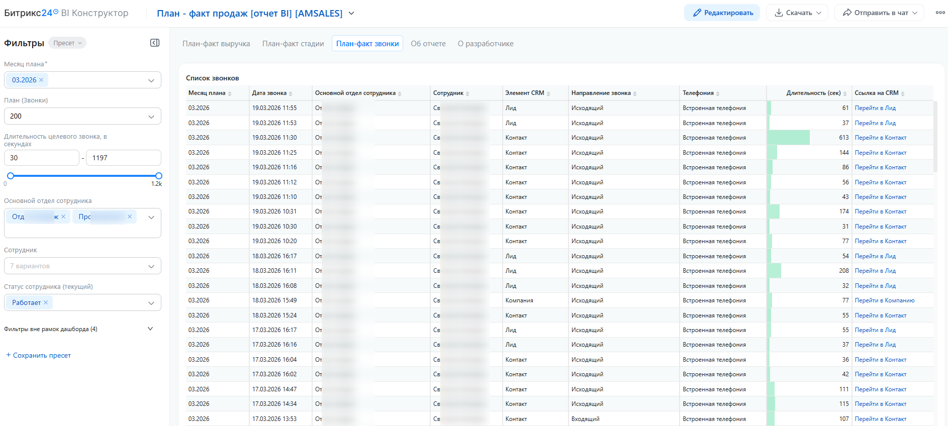 Контроль качества звонков: Во вкладке по звонкам предусмотрен фильтр длительности в секундах. Он позволяет отсекать слишком короткие (нерезультативные) вызовы, чтобы в выполнении плана учитывались только качественные контакты.