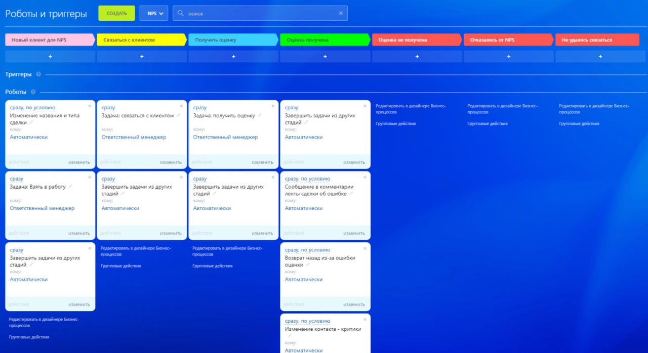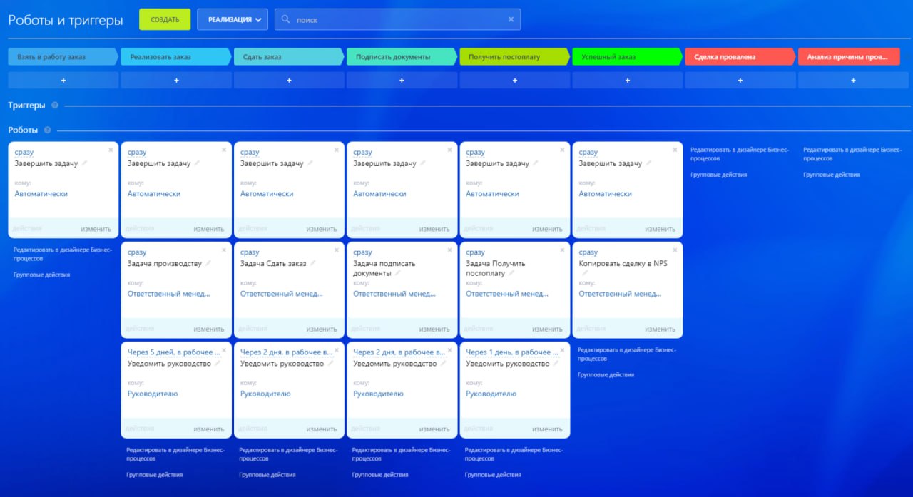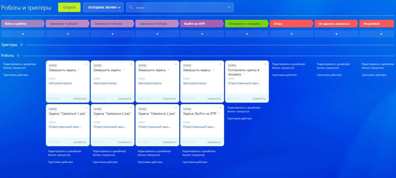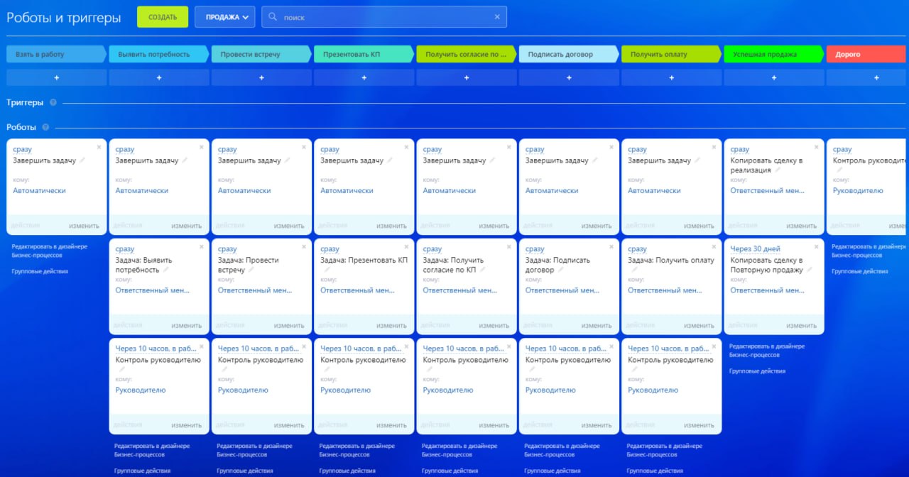 В нашей CRM уже настроены роботы, которые автоматически ставят задачи менеджерам при работе со сделками и лидами. Это помогает оптимизировать рабочий процесс и повысить производительность сотрудников.