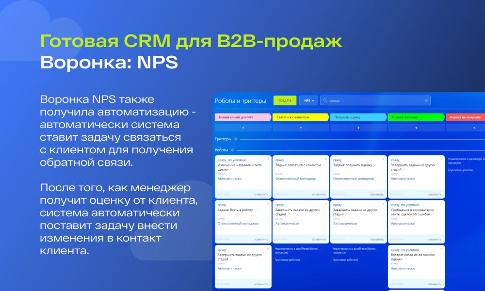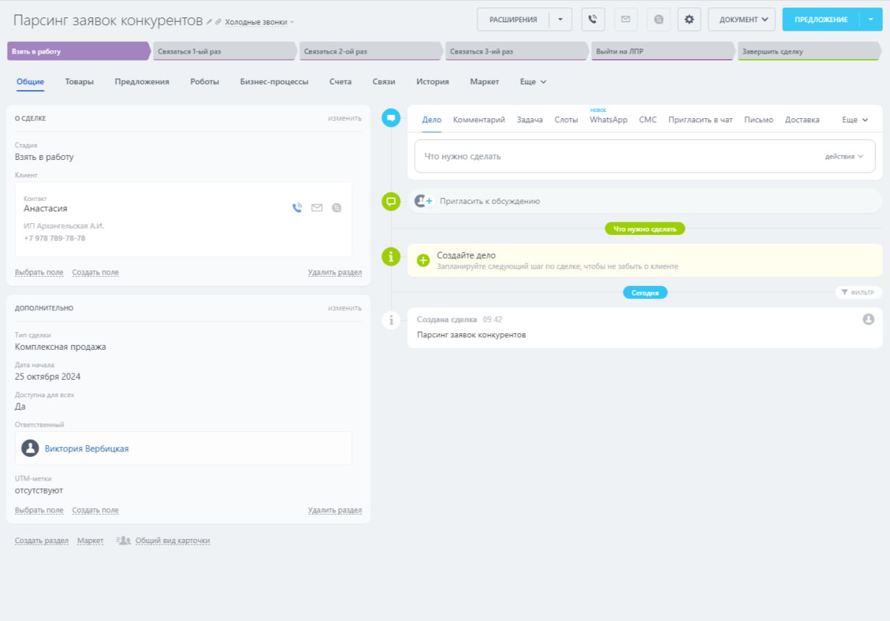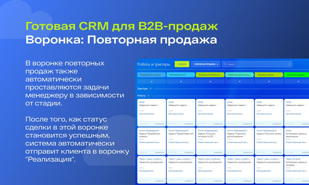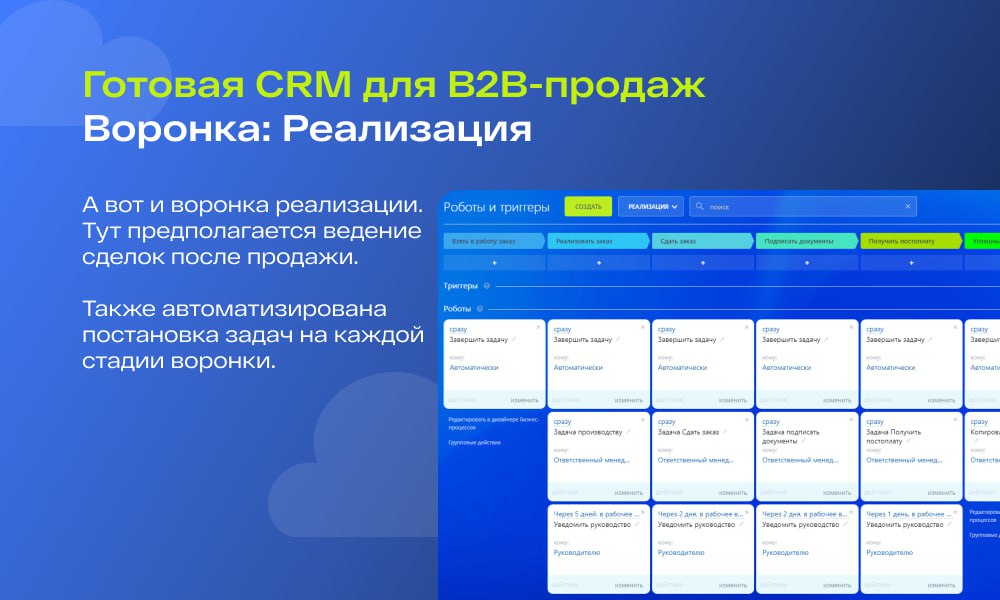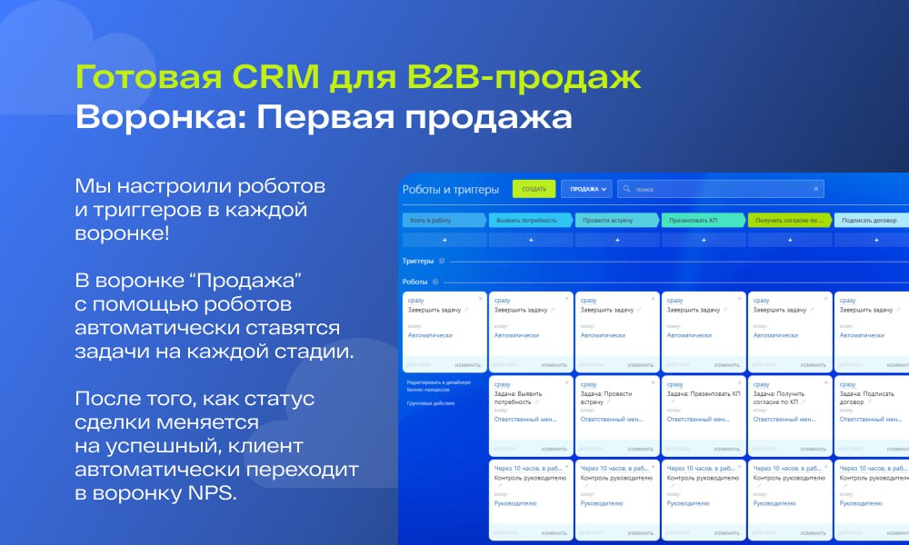 В нашей CRM уже настроены роботы, которые автоматически ставят задачи менеджерам при работе со сделками и лидами. Это помогает оптимизировать рабочий процесс и повысить производительность сотрудников.